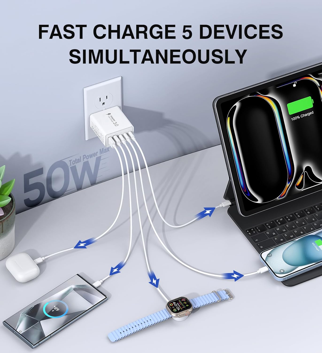 - Compact and Portable:The 5-port charging cube boasts an incredibly compact size that enhances portability. All of this power is housed in a pocket-friendly compact body wherever the journey takes you. Perfect for home, office and on the go. Is the best significant other on the go. We offer this 50W 5-port USB C wall charger (cable not included)
