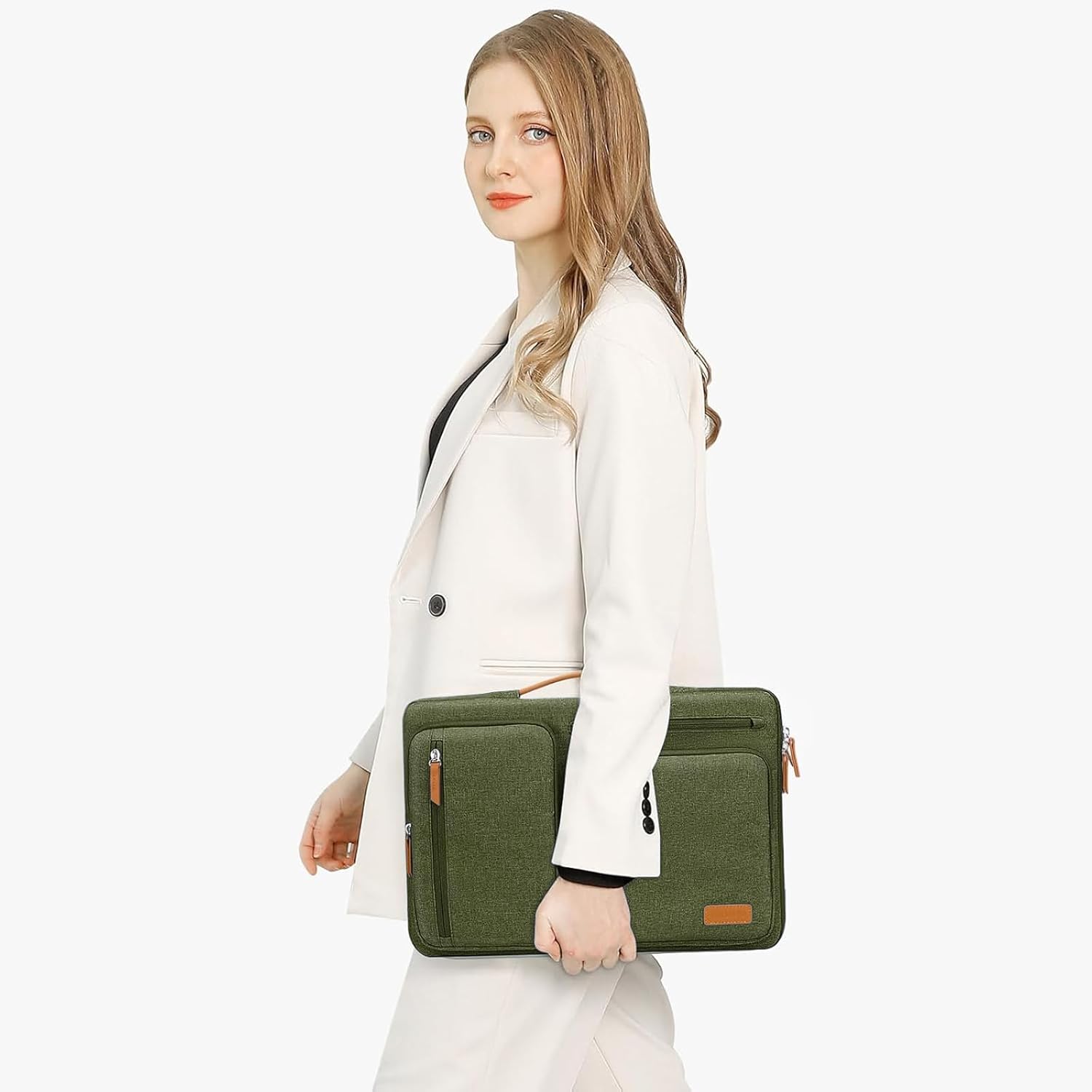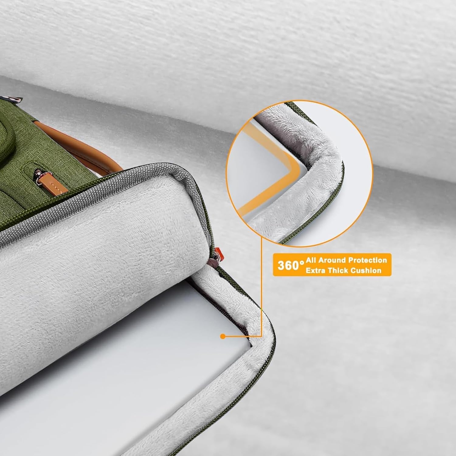 - 360 degree all around protective reinforced interior edge briefcase carrying case bag protect your laptop from any accidental dropping. Extendable handle design makes it to carry your laptop around in comfort, you can also tuck away the handle. Side opening zipper design, avoid accidental dropping of your laptop while carrying. 4 front zipper pockets provide enough space to keep mouse, earphone, pens and notepads, offering added convenience.