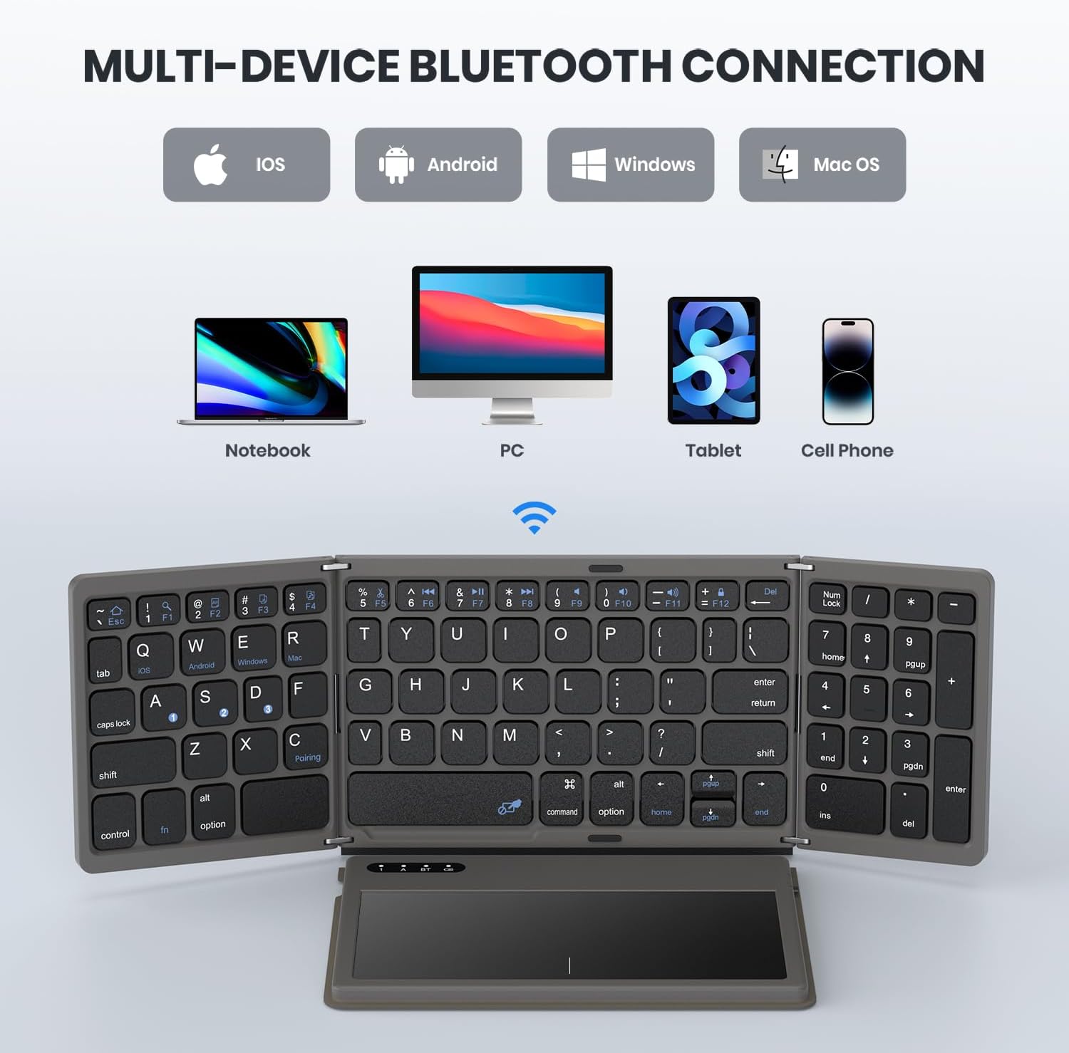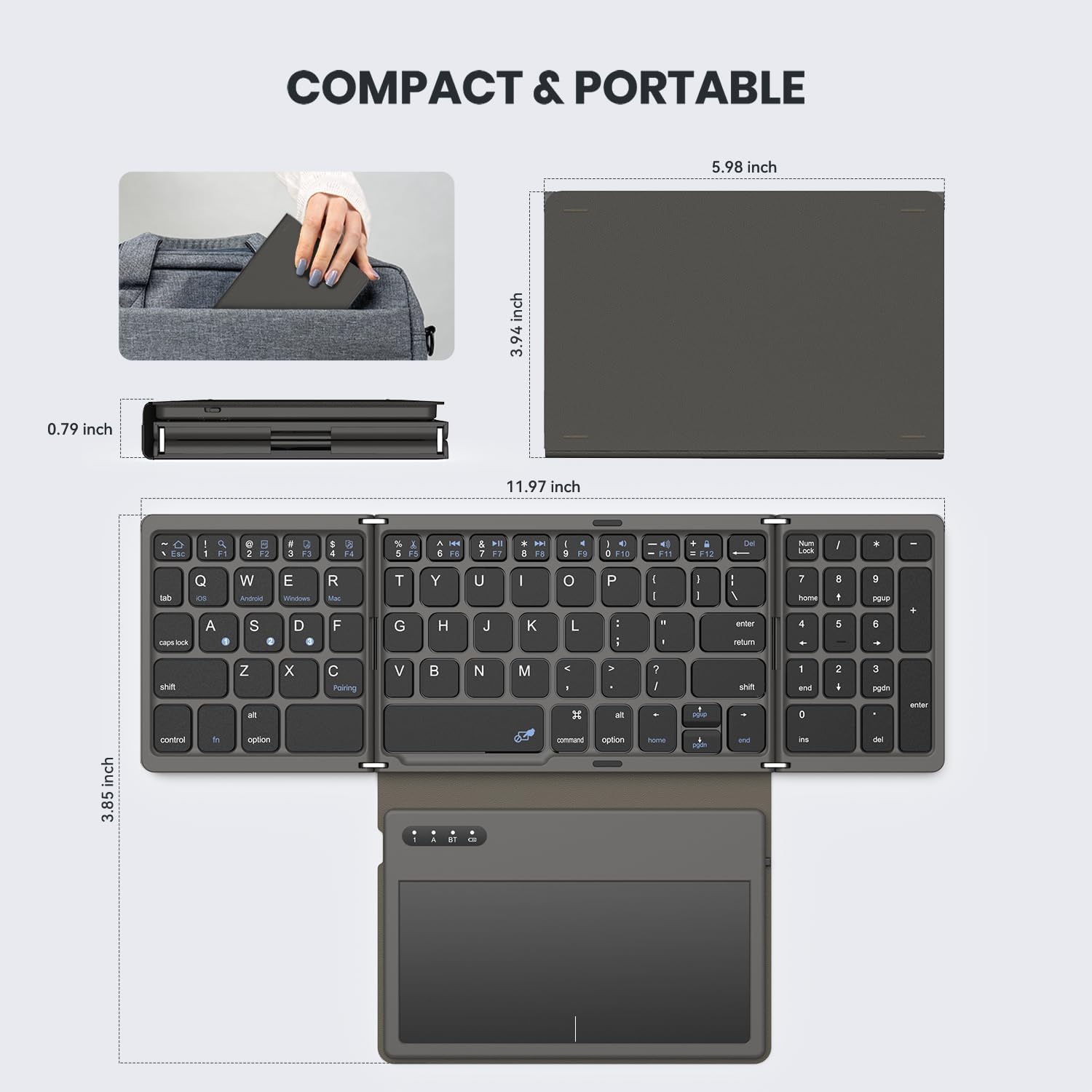 - 【Triple-Folding Portable Bluetooth Keyboard】Fold it in slide into your work bag or simply stash in your carry-on for business trips. Wherever work takes you, enjoy familiar desktop-style typing on bluetooth keyboard with number pad and a touchpad surface 20% larger than previous models. Navigate screens and multitask efficiently without packing a separate mouse