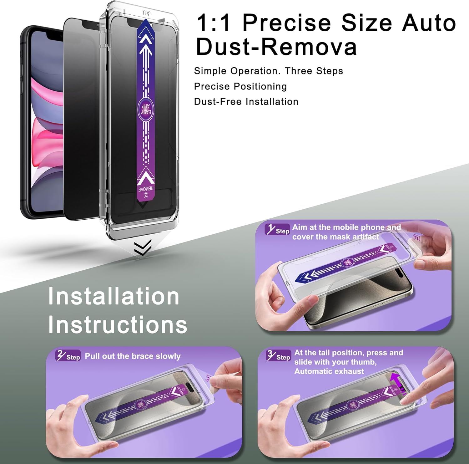 - Automattc Dust Removal Technology:Say goodbye to installation hassles with our iphone 11 screen protector! Simply close and pull to automatically align and remove dust—no more worries about air bubbles or dirt. Watch our installation video for easy steps and tips for the second pack. Perfect for those using a privacy screen iphone xr