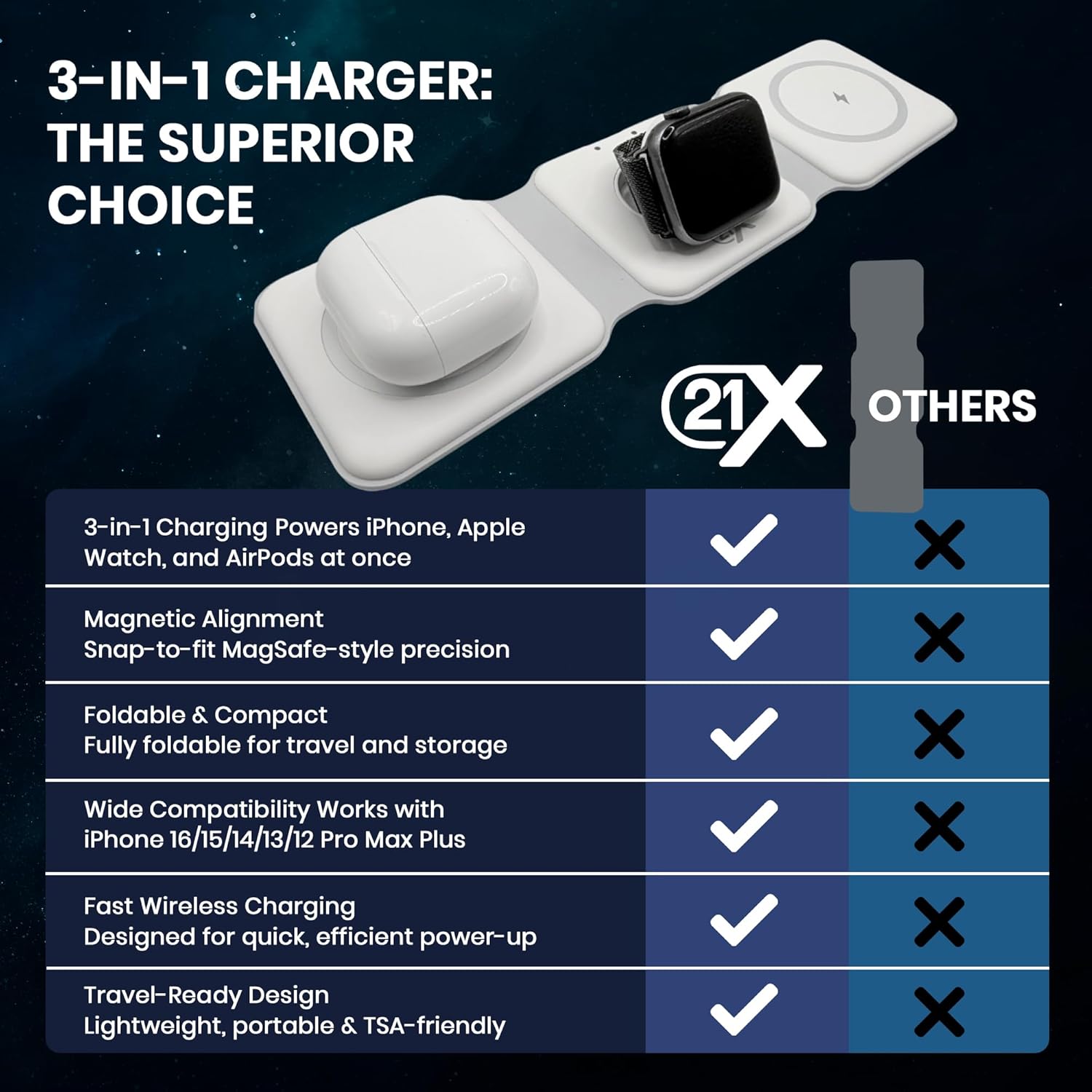- FOLDABLE & TRAVEL-READY CHARGING PAD: Designed for portability, this foldable magnetic charger is a travel essential for jet setters and digital nomads. It folds flat to fit easily into a backpack, laptop sleeve, or carry-on. Whether you’re at an airport lounge, hotel, or coworking space, you can unfold and charge all your Apple devices in one spot—no need to search for multiple outlets or bring several chargers.