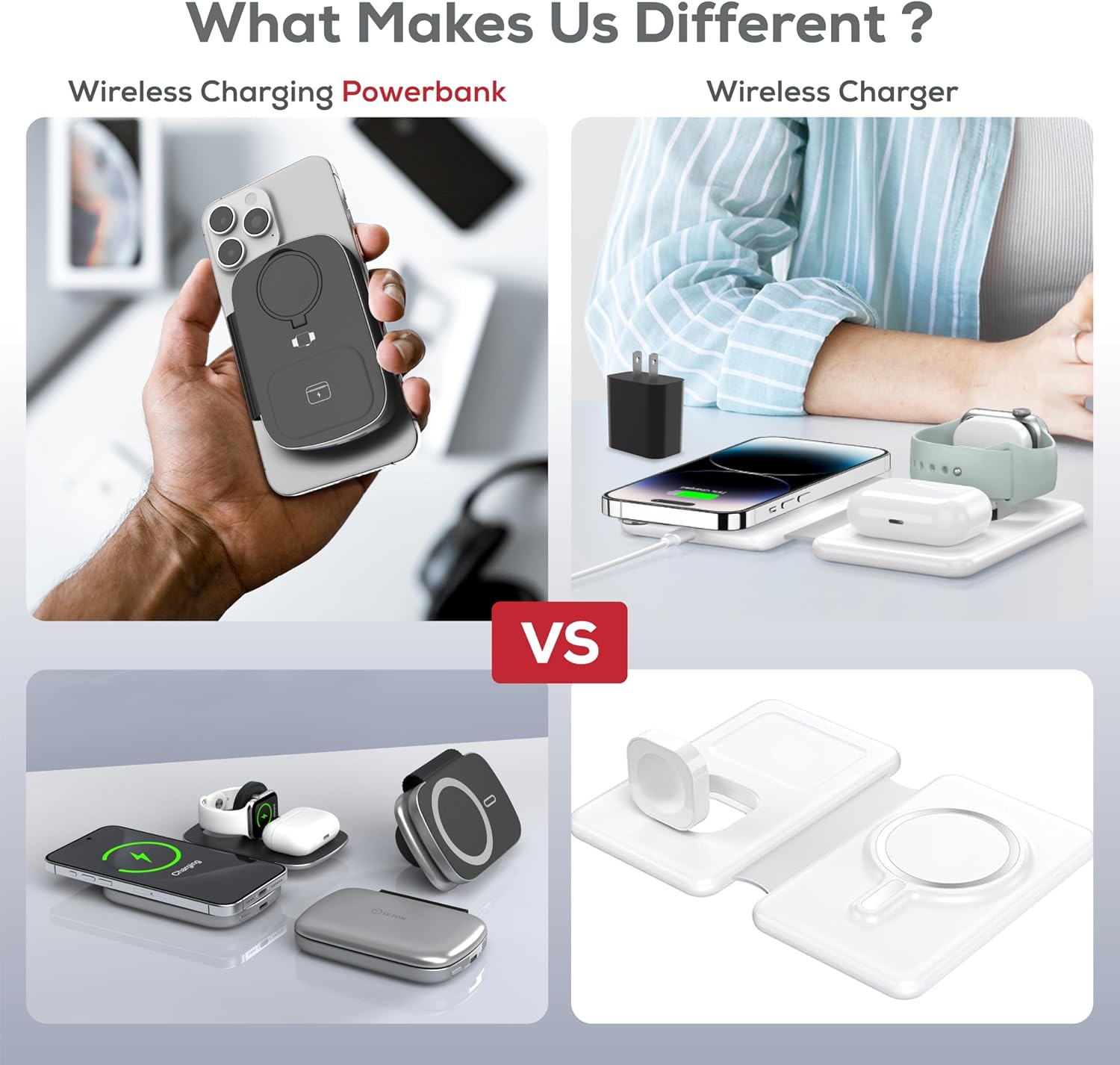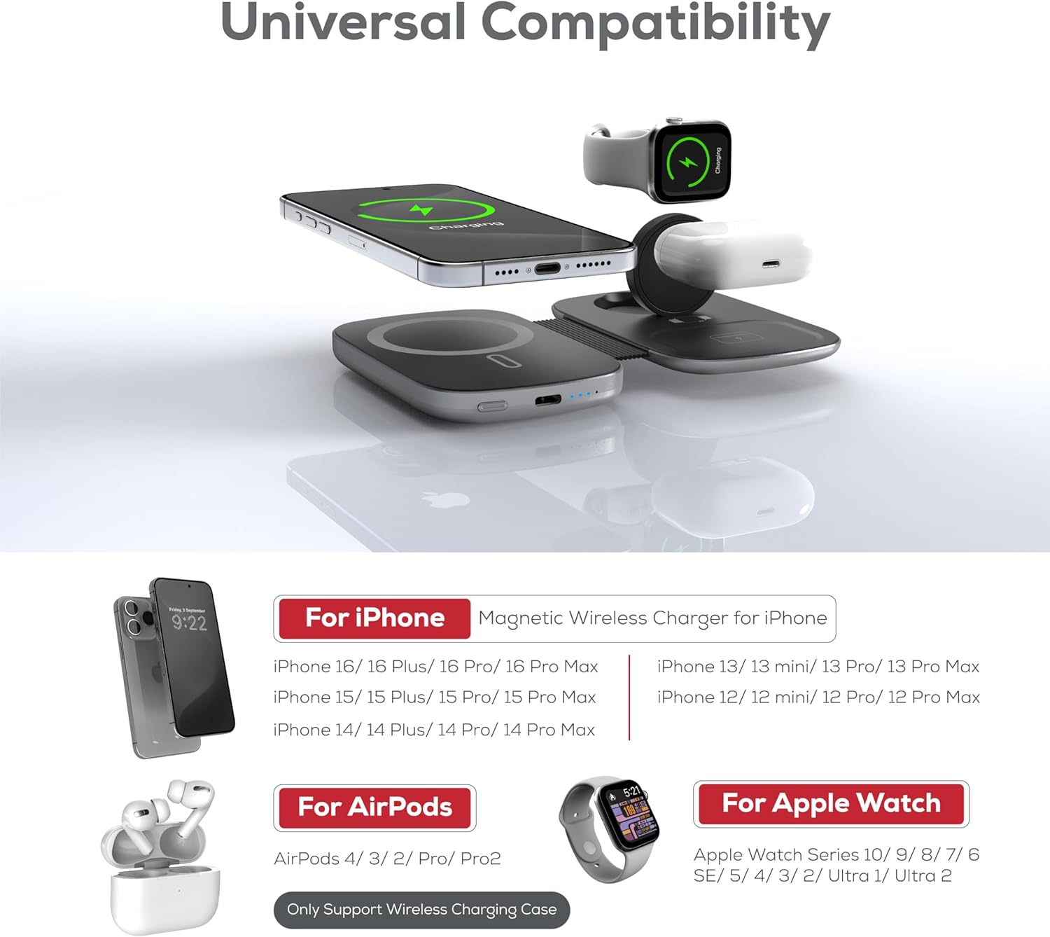 - World's First 3 in 1 wireless charger with 5000 mAh power bank: This product is a powerful 3 in 1 portable magnetic wireless charger with 5000mAh power bank. The wireless charger features 3 Qi-compatible charging mats, having the ability to charge iPhones (16/15/14/13/12), Airpods, and Apple watches (9/8/7/6/SE/5/4) simultaneously.It can be folded for easy storage and travel carrying. This is the best 3-1 wireless charging station for Apple devices.