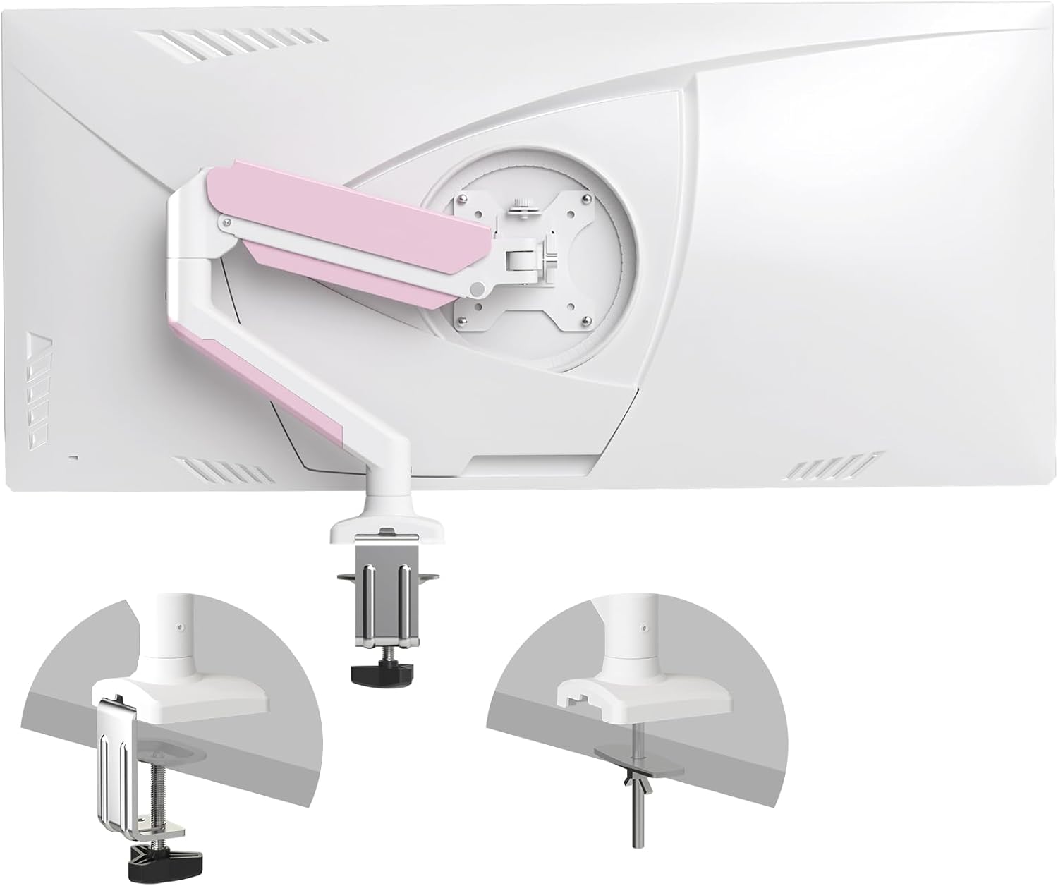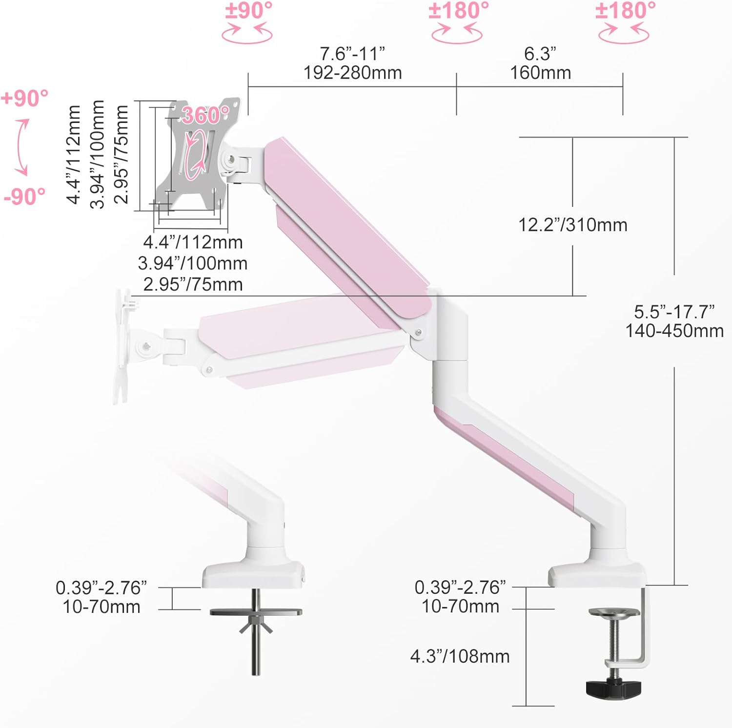 PHOLITEN Single Monitor Arm Fits 13-32 inch,4.4-19.8lbs Screen, Fully Adjustable Gas Spring Arm, Computer Monitor Stand with VESA 75 * 75mm/100 * 100mm Mount,White & Pink