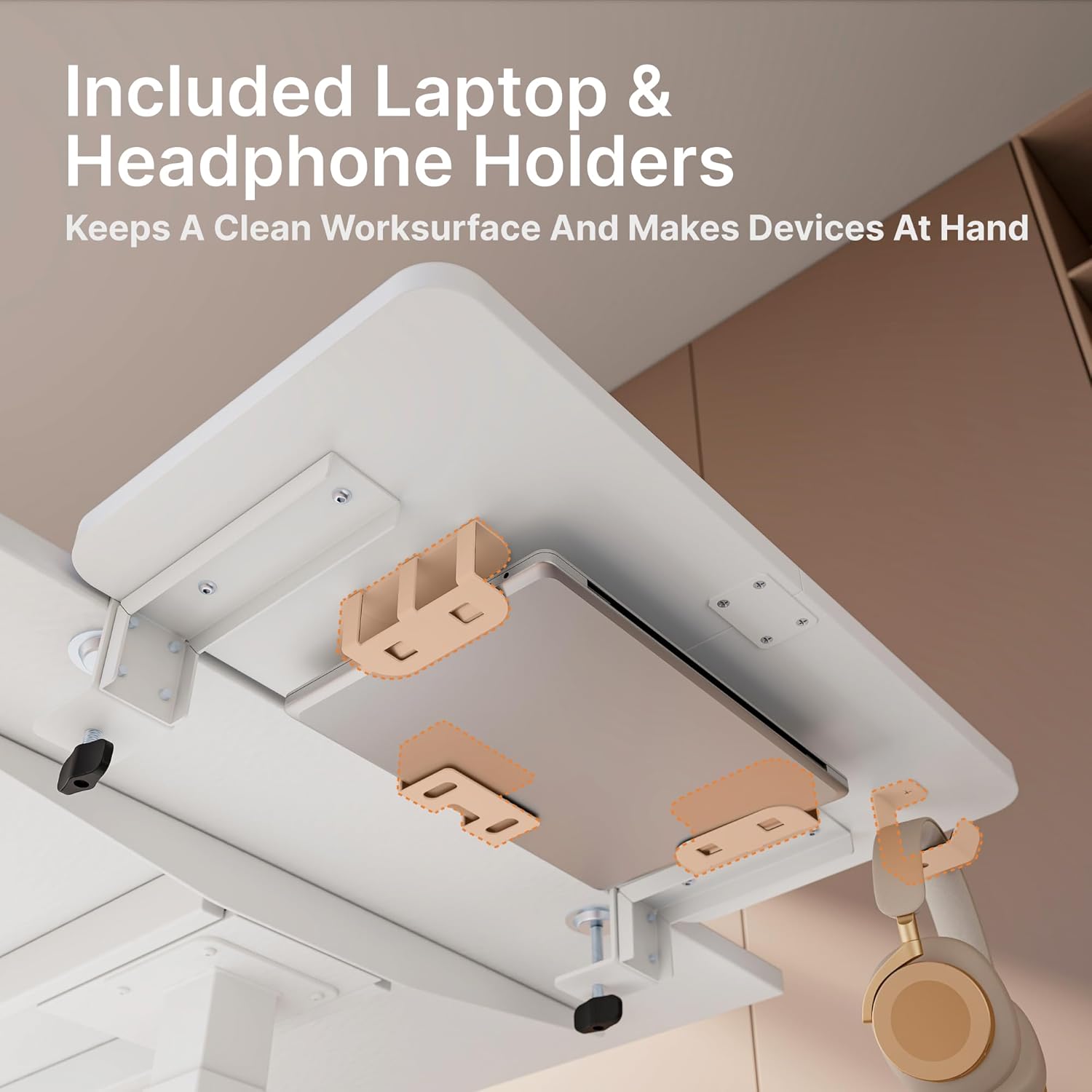 - INTEGRATED LAPTOP AND HEADPHONE HOLDER: Maximize efficiency with the thoughtfully designed bottom that includes a laptop stand and headphone hook. These additional storage options help keep your workspace tidy and free from clutter.