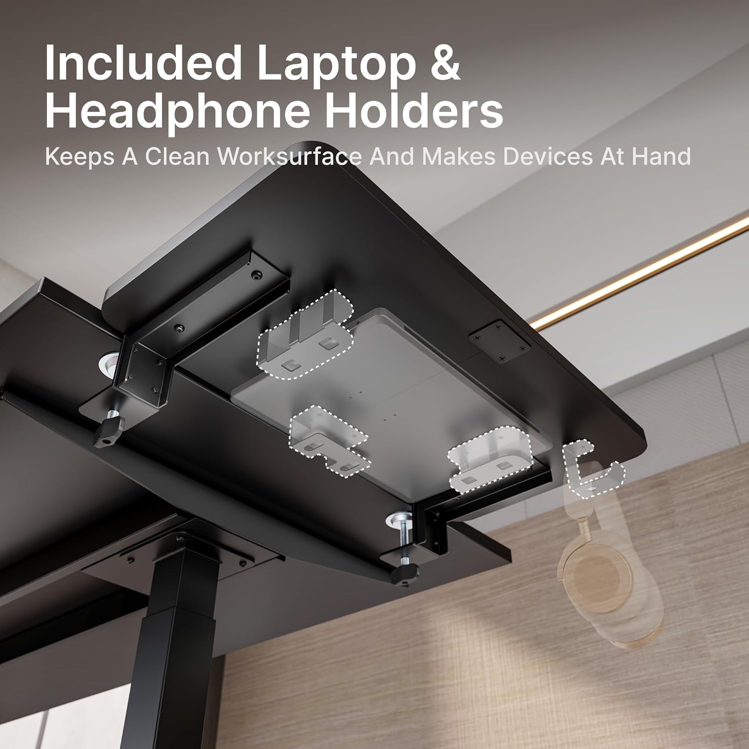 - INTEGRATED LAPTOP AND HEADPHONE HOLDER: Maximize efficiency with the thoughtfully designed bottom that includes a laptop stand and headphone hook. These additional storage options help keep your workspace tidy and free from clutter.
