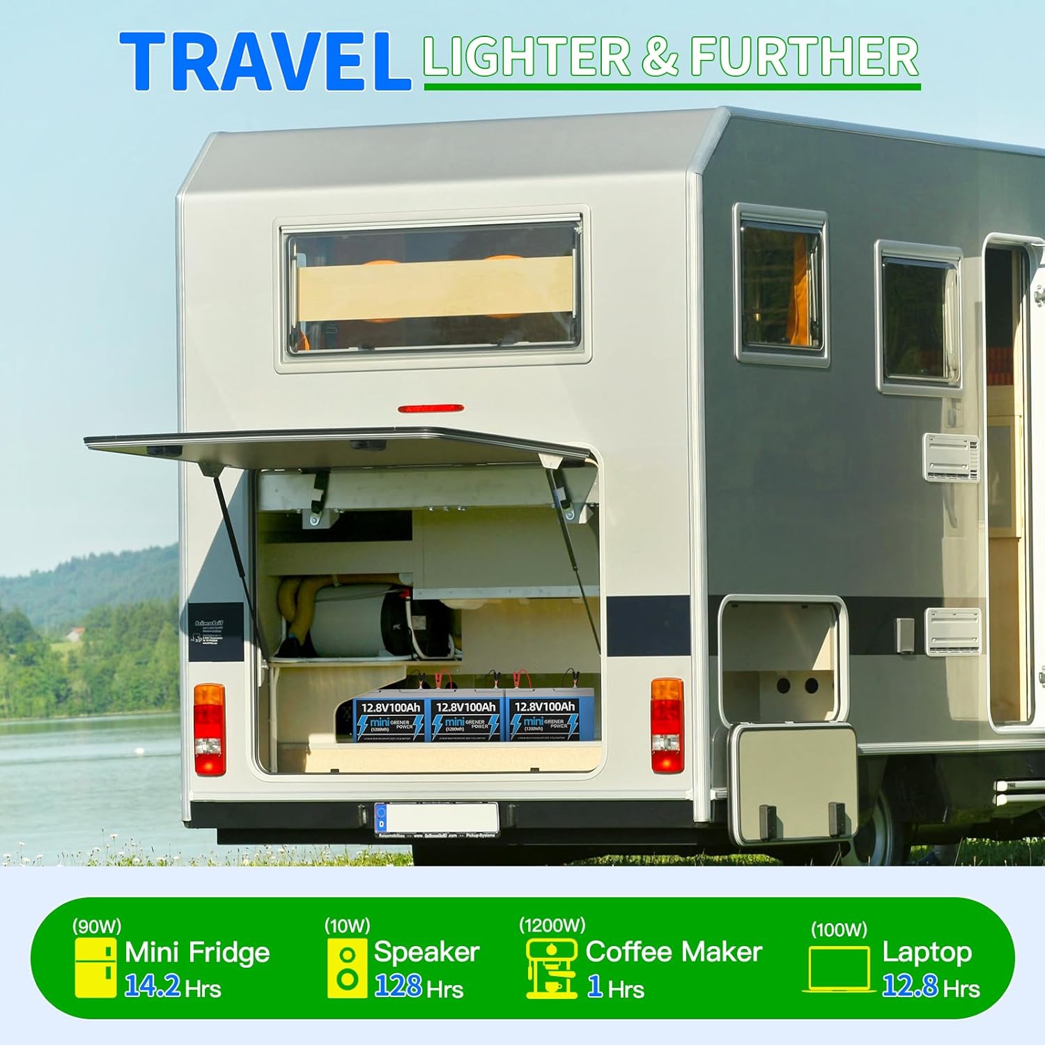 - 💯【Mini in Size Max on Power】GrenerPower 12.8V 100Ah lifepo4 battery mini measures 9.0*5.4*8.35inch(Height Included Terminals), 35% smaller than before. Exquisite technology makes the 12V lithium battery mini size enough but powerful as usual (100% 1280Wh energy storage), install the mini 100ah lifepo4 battery wherever you want without regard for space.