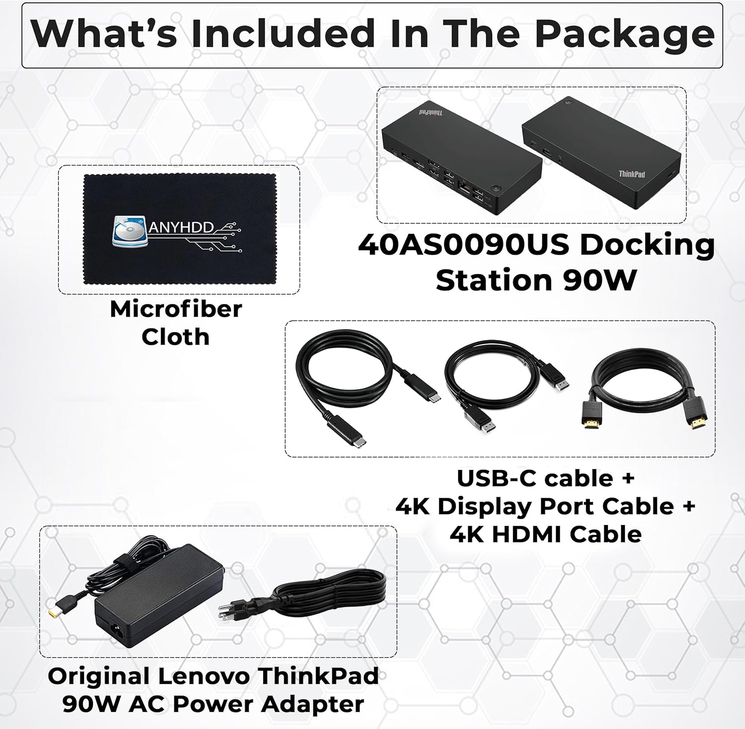 - [Package Includes] - Lenovo 40AS0090US Laptop Dock Renewed, USB-C Gen-2 AC Adapter 90W , 1x HDMI Cable, 1x Displayport Cable, USB C Cable, Microfiber Cleaning Cloth
