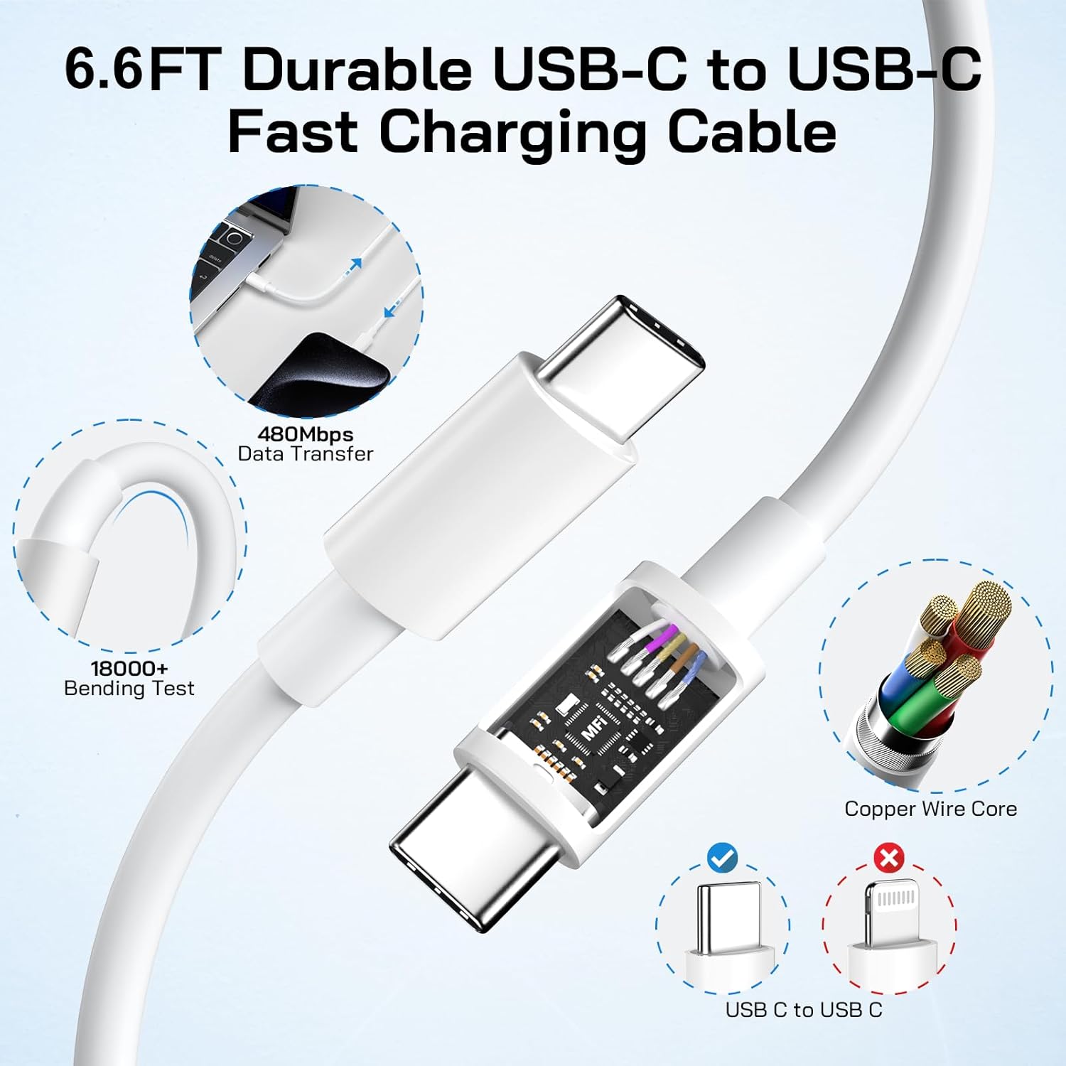 - 【6.6FT Extra Long USB C to UCB C i Phone 15 Charger Cord】 With 2 pack 6.6FT fast charger cables that equipped with smart chip and high quality copper core, it ensures a rapid 3A charging speed and 480Mbps data transfer speed. The user-friendly design and longer charging distance enables you charge for i Phone and i Pad from a more comfortable occasions like bedroom, office or even travel. It has passed 18000+ times of bending tests to avoid shortened lifespan due to aging and usage.