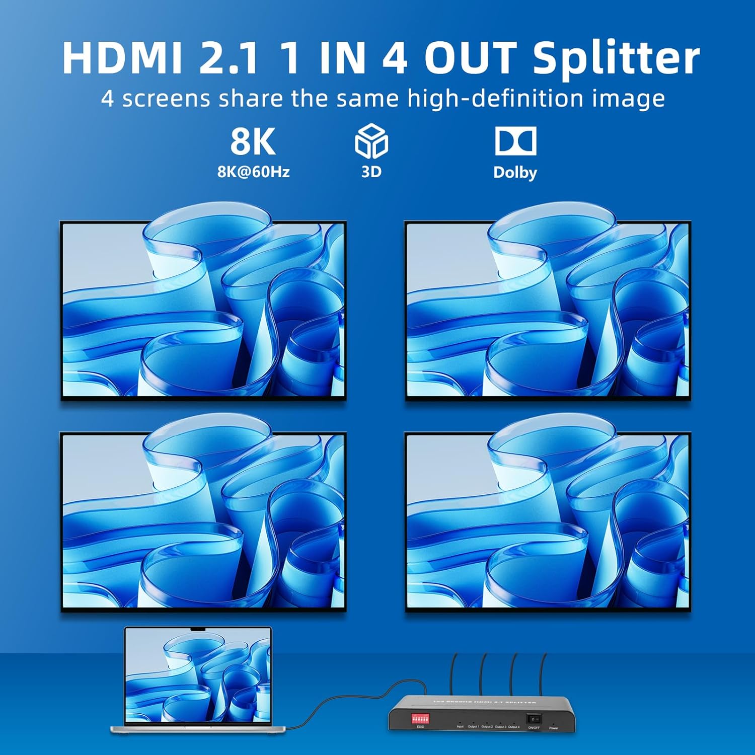 8K HDMI Splitter 1 in 4 Out,with EDID, 3D Stereo, 12-bit Deep Color, 48Gbps, Plug & Play, HDMI Splitter for Windows, Mac, Linux, Projectors, Laptops, Desktops (SP104SKE)