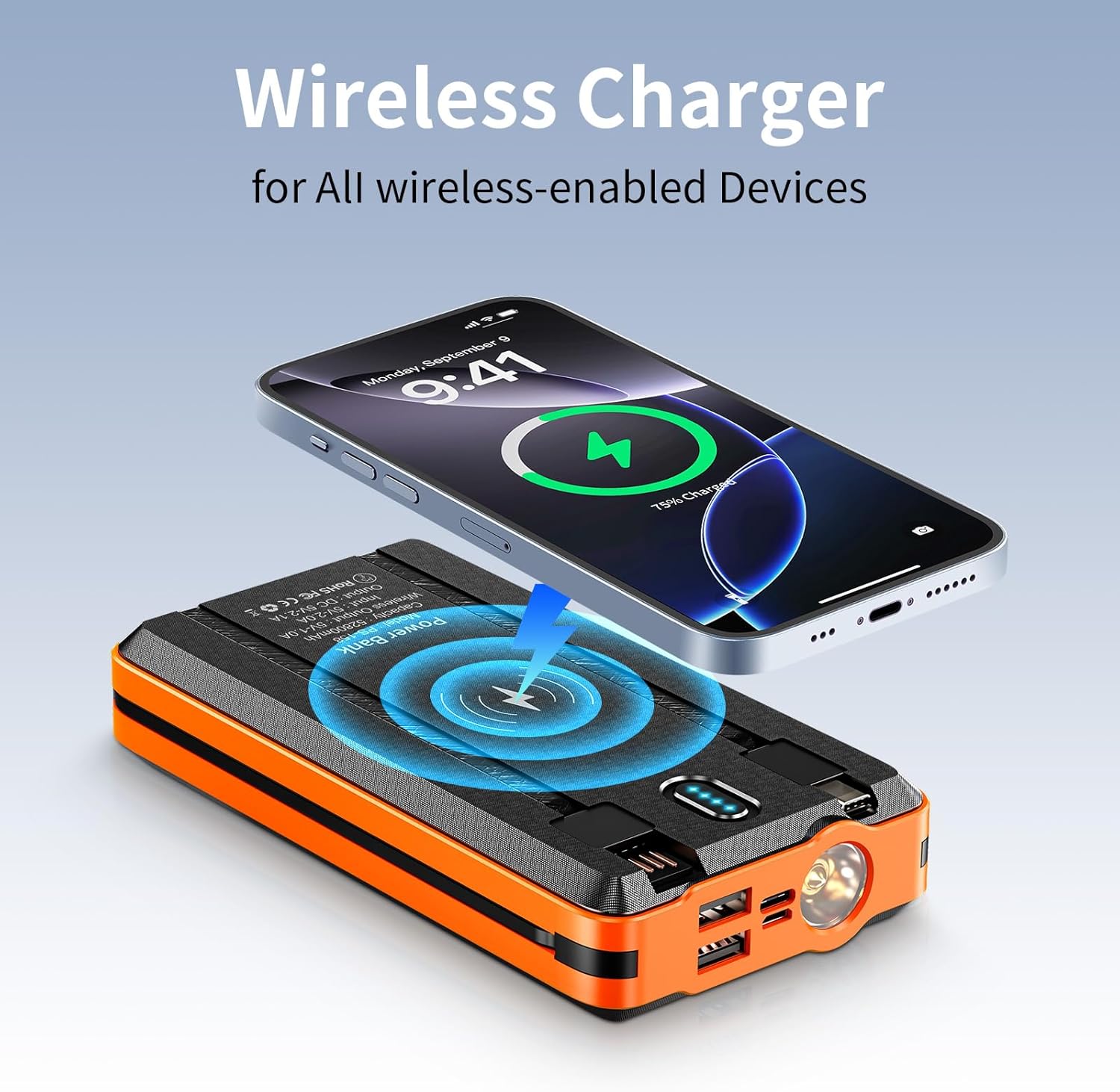 - 【Built-in cable and charging】: The power bank itself carries 3 output cables for Apple, Android, type-c, and one USB input cable. It also provides 2 USB output ports and 2 input ports (type-c and Android), which can be 5 at the same time. In addition, it also provides a wireless charging function, just put the mobile phone with wireless function on the back, and lightly press the power button to use it. Really one machine with multiple functions, fully satisfying daily life use.