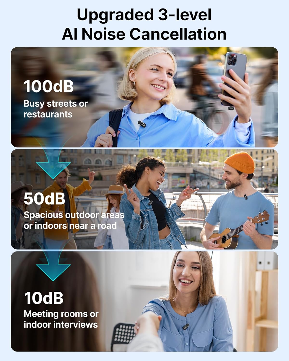 - Upgraded 3-level AI Noise Cancellation: BOYA mini wireless microphone with a one-click button for adjusting noise reduction levels helps to cut off noise interference. With DSP noise cancellation technology ensures your voice clear in any scenario. The microphone maintains clarity at a maximum sound pressure level of 120dB, making it ideal for recording in high-pitched environments.