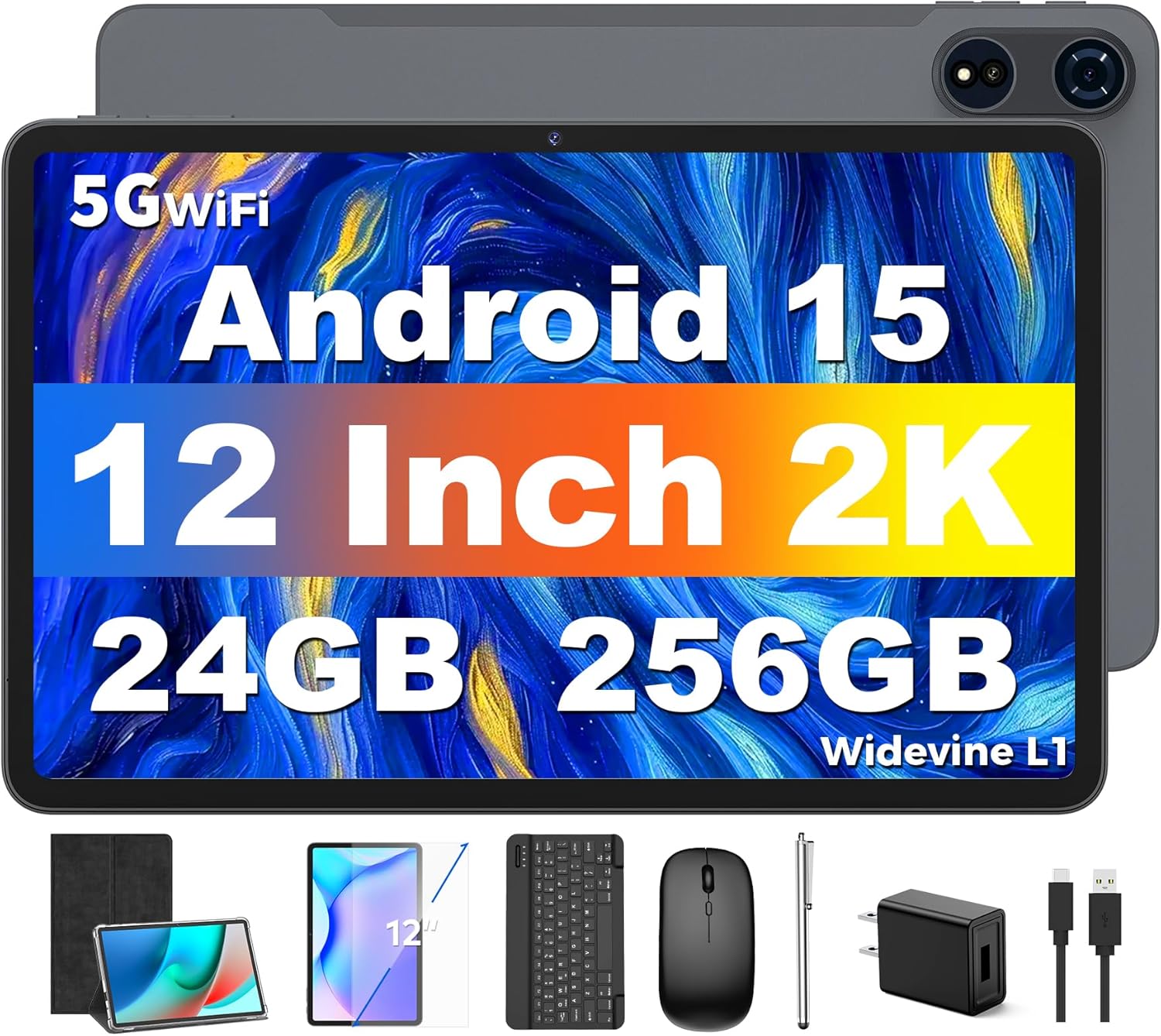 Tablet 12 inch Android 15 Tablets, 24GB(8+16)RAM+256 Storage(Expand to 1TB), Android Tablet with Keyboard, Octa-Core, 2K 2000x1200 Display, 16MP Dual Camera, 8000mAh, 5G WiFi,GPS,Bluetooth 5.0(Black)