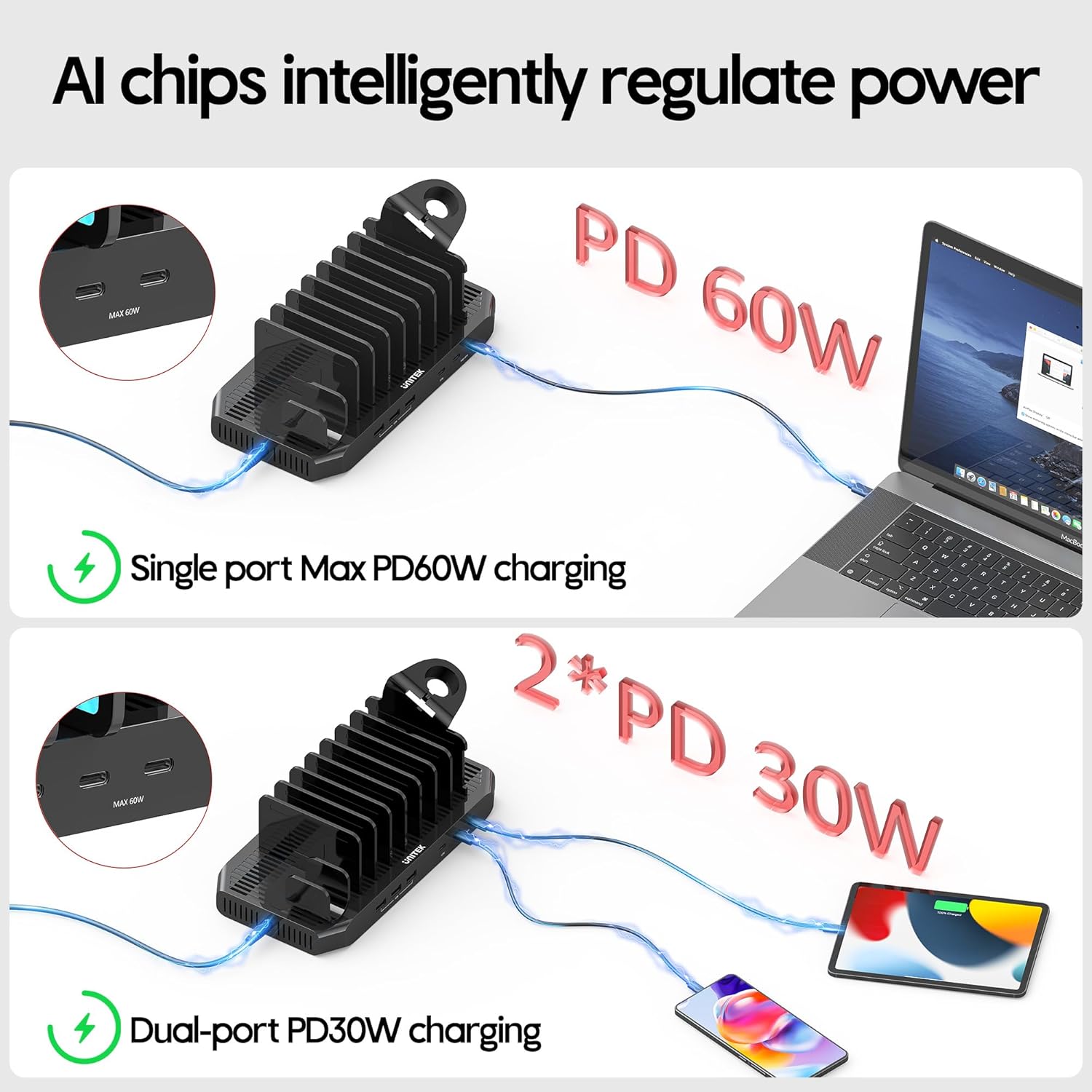 - PD Fast Charging: This 6-Port USB charger station has built-in 2 Type-C PD Ports, which support PPS charging protocol, to auto-adjust the voltage and current in real-time, depending on a device's charging status. Only one PD port is used, outputs type-C PD 60W can support up to 20V/3A charging for the iPad, Macbook pro/air, Samsung, Chromebook, HP, DELL and Other USB-C computer laptop and devices. Two PD ports are used together, Type-C PD 30W can charge for your new iPhone 16/15 series up to 3x faster than original 5W charger.