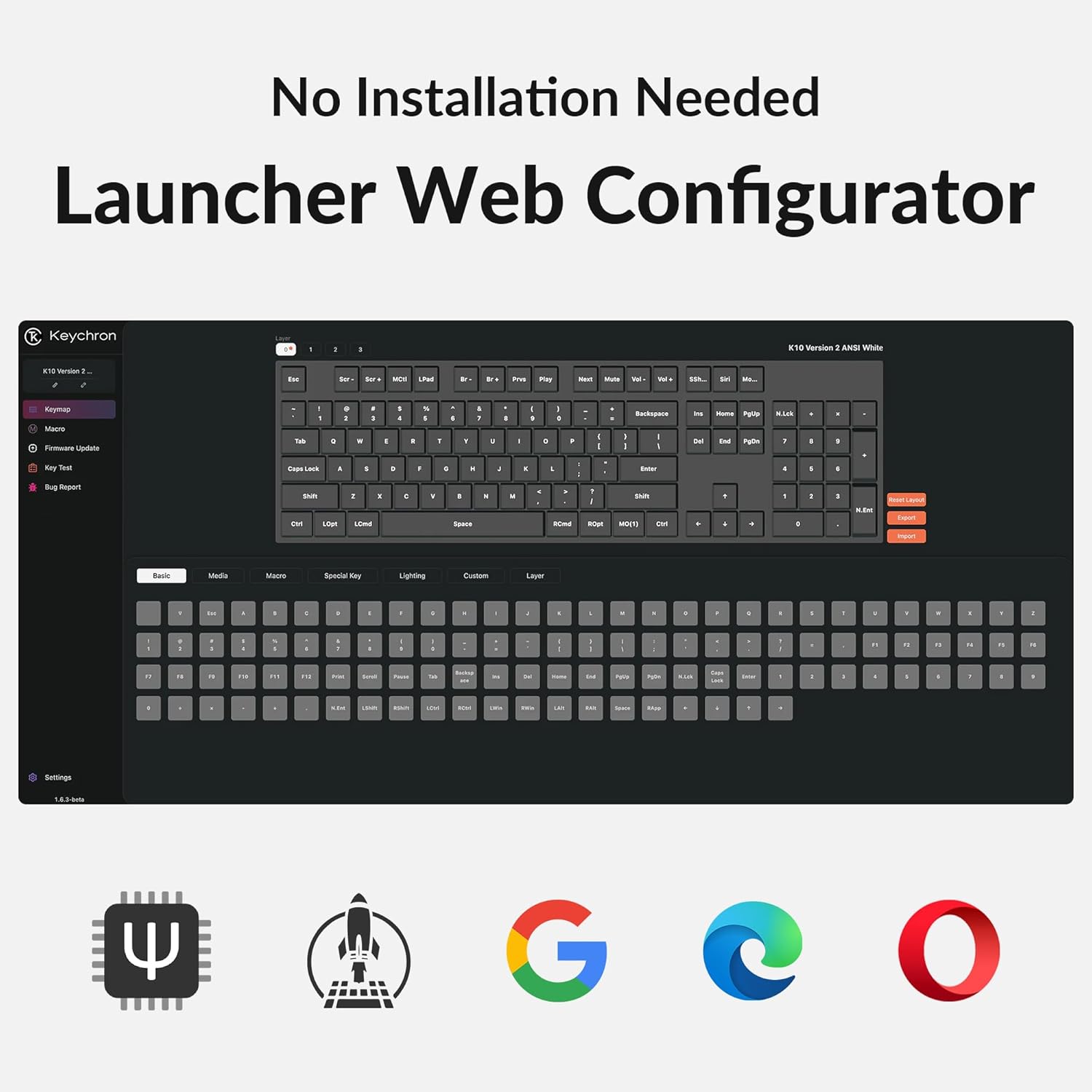 - Open-Source & Customizable Powered by QMK firmware, the K10 Version 2 ensures transparency and security. The Keychron Launcher web configurator makes key remapping, updates, and feature adjustments effortless—no installation required.