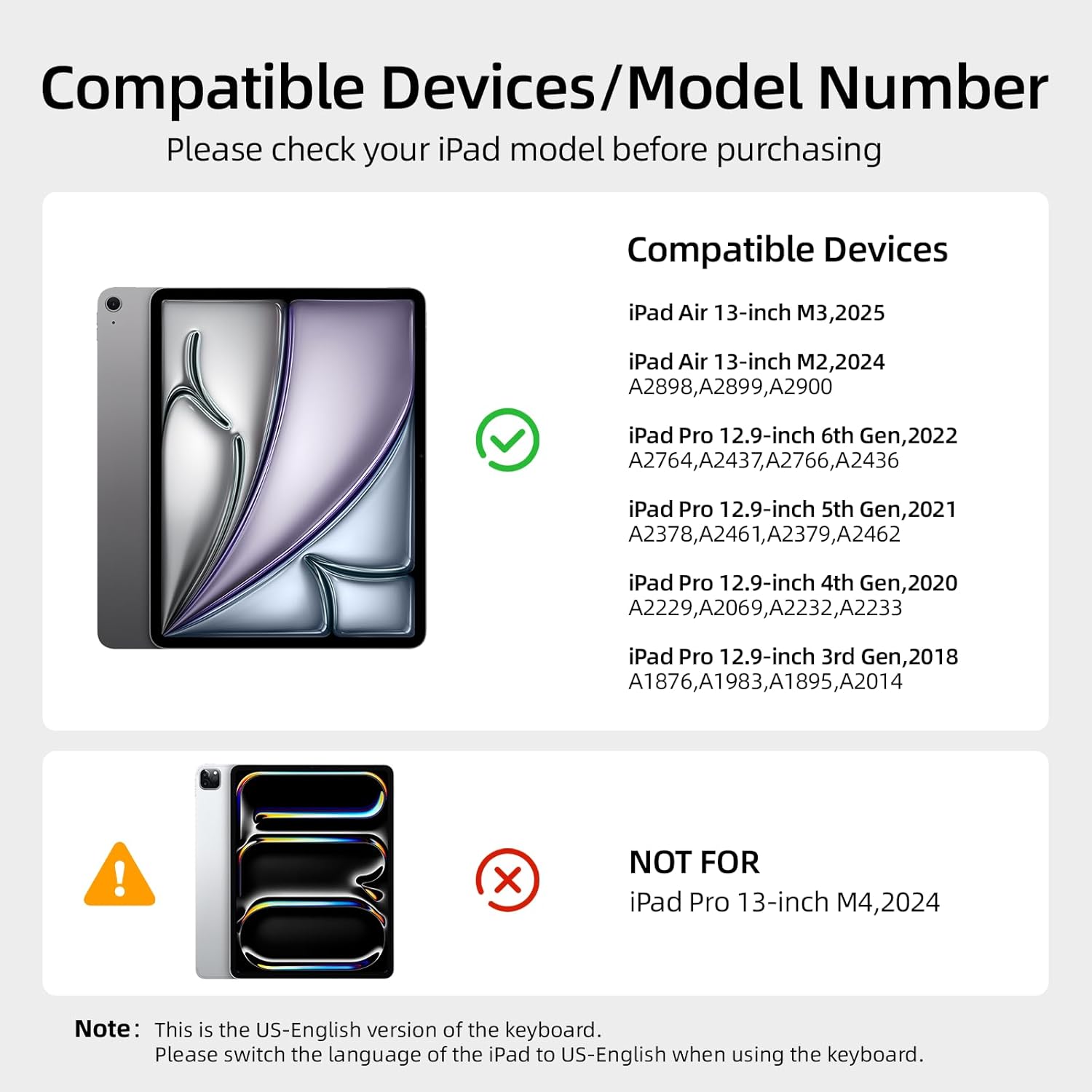 - Compatible Devices : iPad Air 13-inch M3 2025 & M2 2024,iPad Pro 12.9-inch(6th-2022,5th-2021,4th-2020,3rd-2018 Gen).NOTE:NOT compatible with iPad Pro 13-inch M4 2024 iPad Air 13-inch M3 2025 & M2 2024,iPad Pro 12.9-inch(6th-2022,5th-2021,4th-2020,3rd-2018 Gen).NOTE:NOT compatible with iPad Pro 13-inch M4 2024