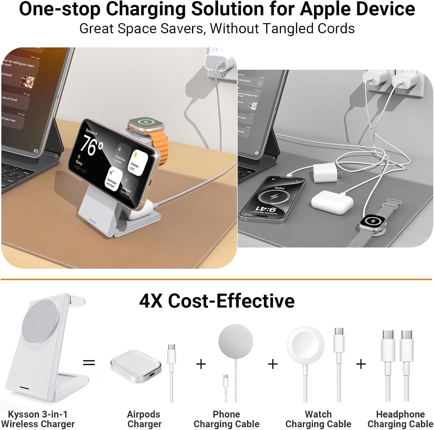 - ⚠ Notes:Please identify brand store "Kysson" for purchase! 🎒【Foldable & Portable, Ultra-Compact Travel Essentials】Designed for eco-friendly travelers, this 3 in 1 wireless charging station apple can be folded 180° into a wireless charger iphone smoothly, achieves the ultimate in lightness, thinness and portability, easily placed in your pocket anytime and anywhere, making this magsafe charger a perfect travel companion.