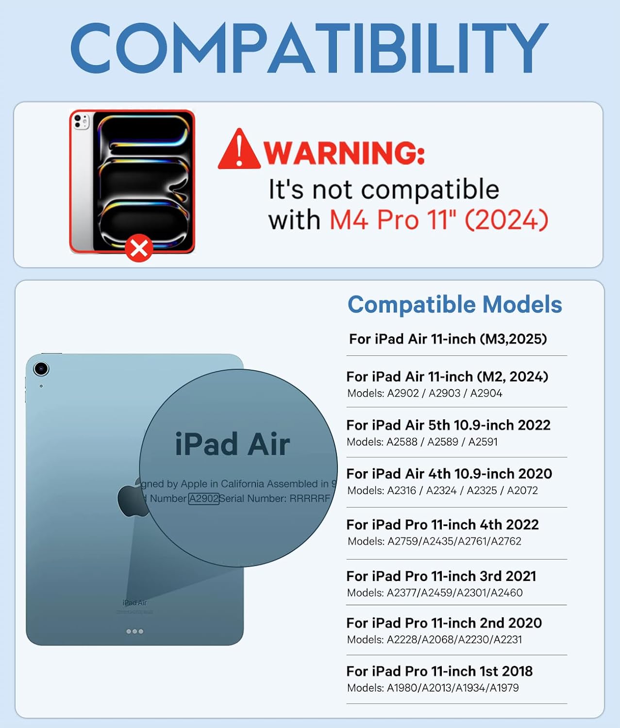 - Compatible Devices : NOT FIT FOR IPAD PRO 11" M4(2024), Tablet, iPad Air 11 inch (M3/M2) 2025/2024, iPad Air 5th/4th Gen., iPad Pro 11" 4th/3rd/2nd/1st Gen.(Not for Pro 11” M4 2024) NOT FIT FOR IPAD PRO 11" M4(2024), Tablet, iPad Air 11 inch (M3/M2) 2025/2024, iPad Air 5th/4th Gen., iPad Pro 11" 4th/3rd/2nd/1st Gen.(Not for… See more