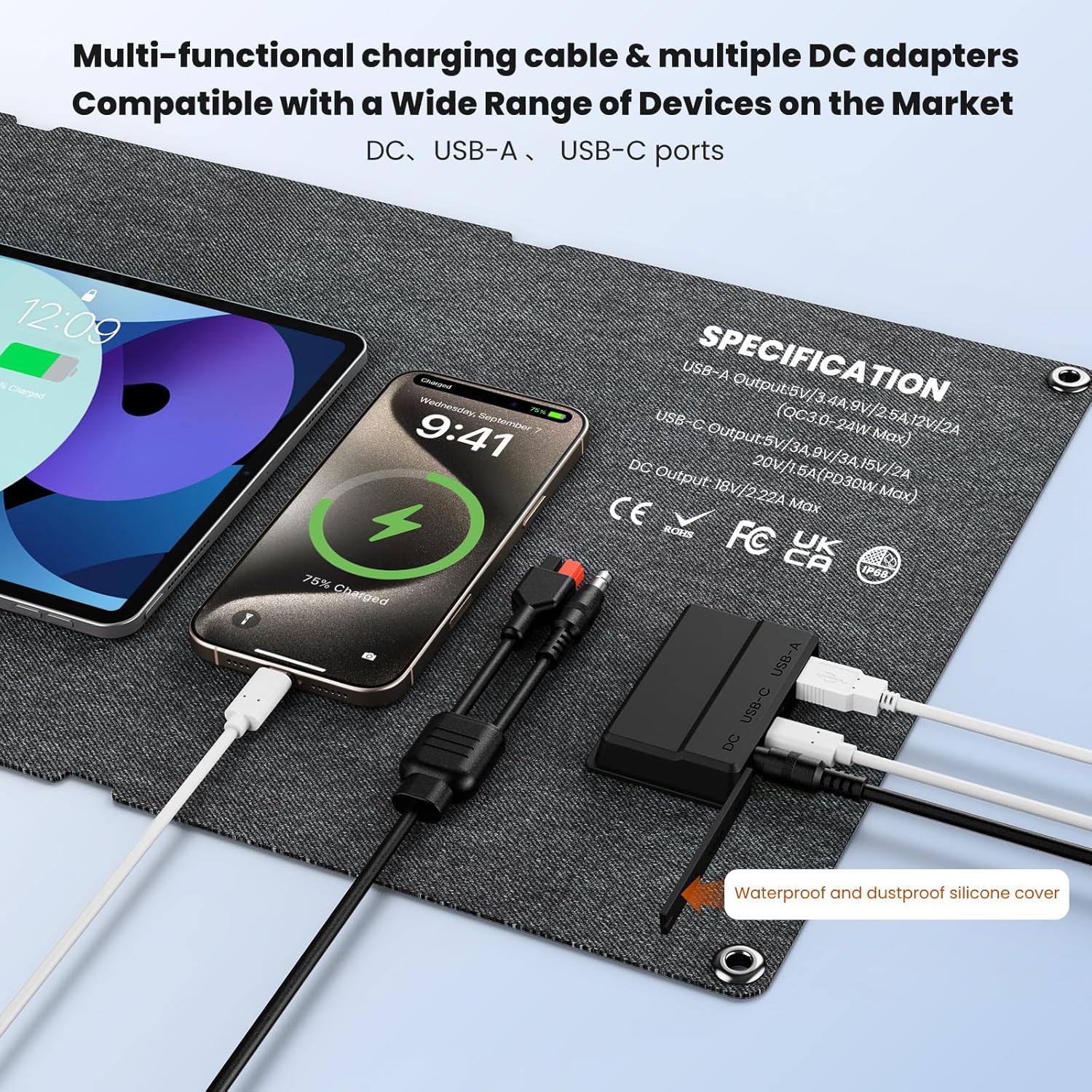 - 【Wide Compatibility】50W Portable Solar Panel Charger has wide compatibility and versatility.SOKOVOLA foldable solar panel has 3 output ports 1 x QC3.0 USB-A (24W Max),1 x USB-C (30W Max),1 x DC (18V/2.77A Max).It can charge smartphones,iPads,digital cameras,GPS,mobile power and other USB devices.