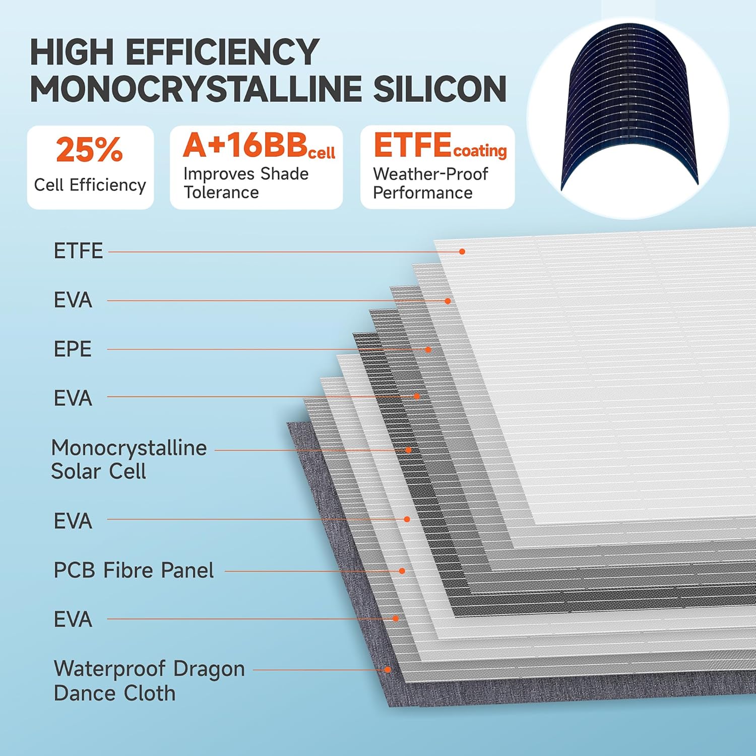 - 【High Conversion Efficiency】SOKIOVOLA 160W solar panels use A+ Grade 16BB monocrystalline solar cells with a conversion efficiency of up to 25%.NextGen N-type solar cell technology not only improves the conversion efficiency and charging speed of the panel, but also enhances its stability and durability. The panels are coated with high transmittance ETFE material and have a slightly convex surface, which increases the contact area with sunlight and improves the energy conversion rate.