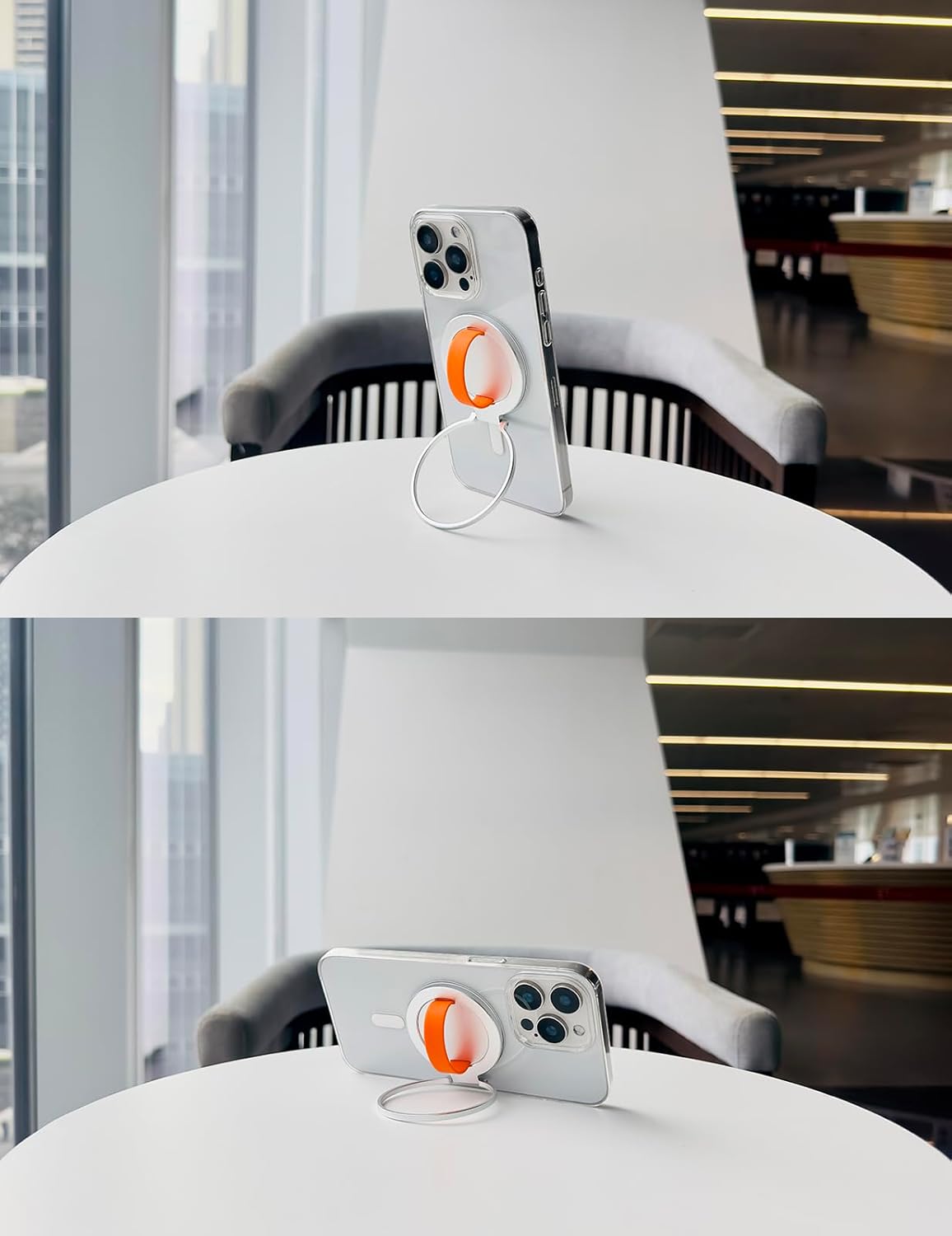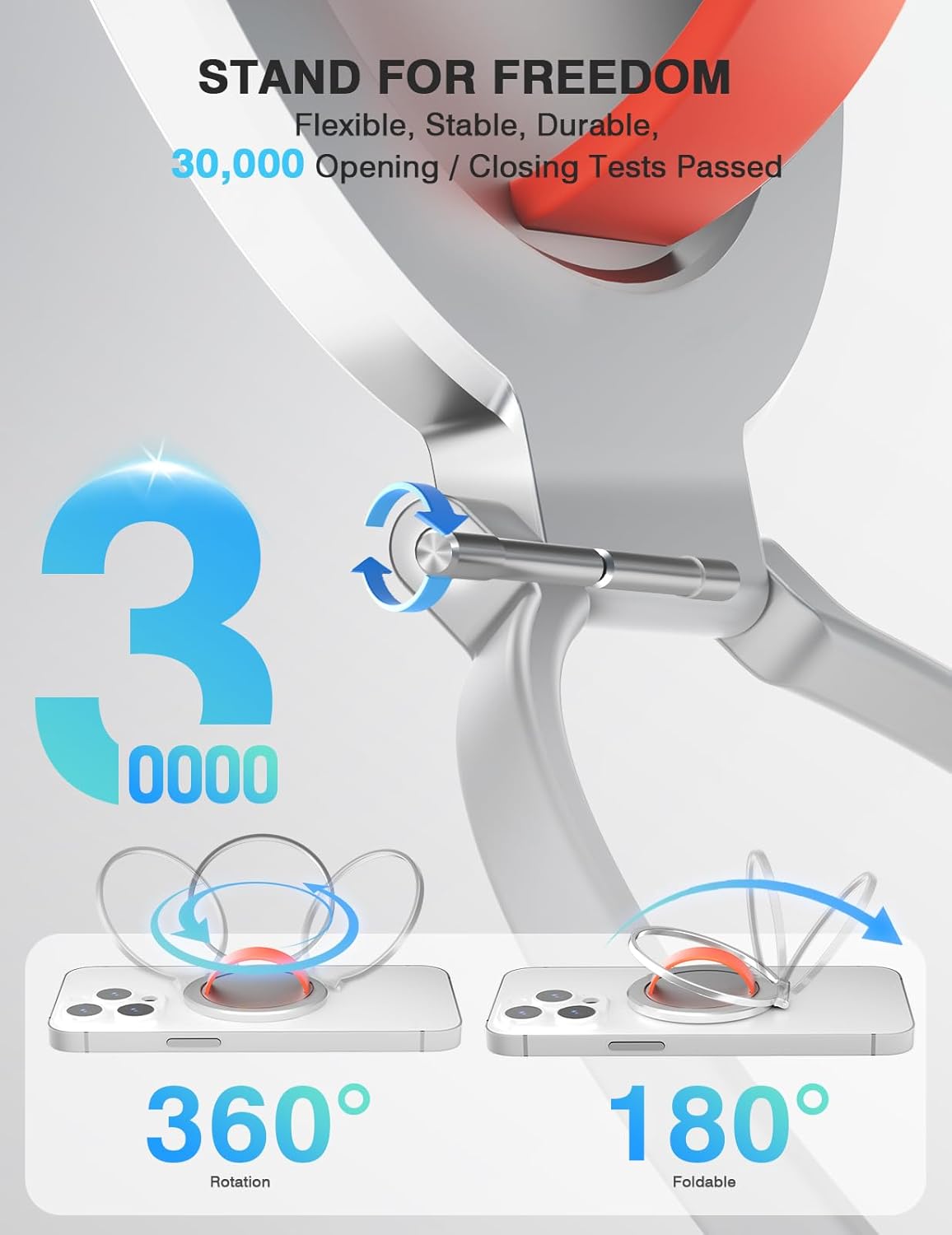 - [Ring Stand - Durable still functional] This incredible stand is crafted from the finest aerospace-grade aluminum alloy and features reinforced hinges that have passed rigorous 30,000-opening-and-closing tests. Its 360-degree rotation and adjustable angle settings ensure optimal viewing for any phone. Its slim profile of just 3.6mm and compact foldable design make it convenient to carry in your pocket when not in use.