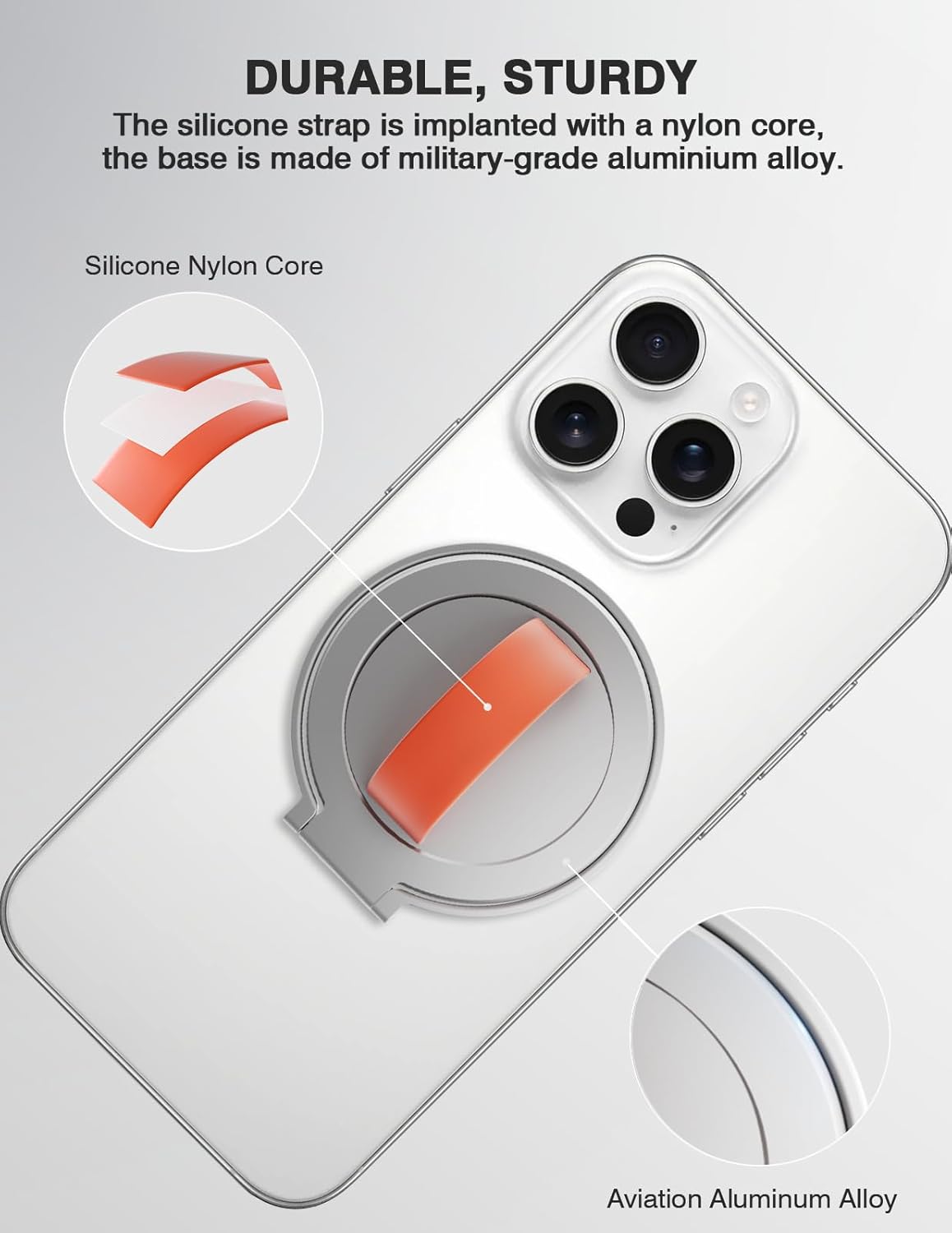 - [Durable Grip - Sturdy Base] The silicone strap of the cell phone grip is implanted with a nylon core, and the silicone band remains undeformed after a stretch test weighing up to 66 pounds, which is pretty impressive! The base of the phone grip is made of military-grade aluminium alloy and precision engineered to ensure unmatched sturdiness and scratch resistance, so you can rest assured it'll be there for you when you need it.