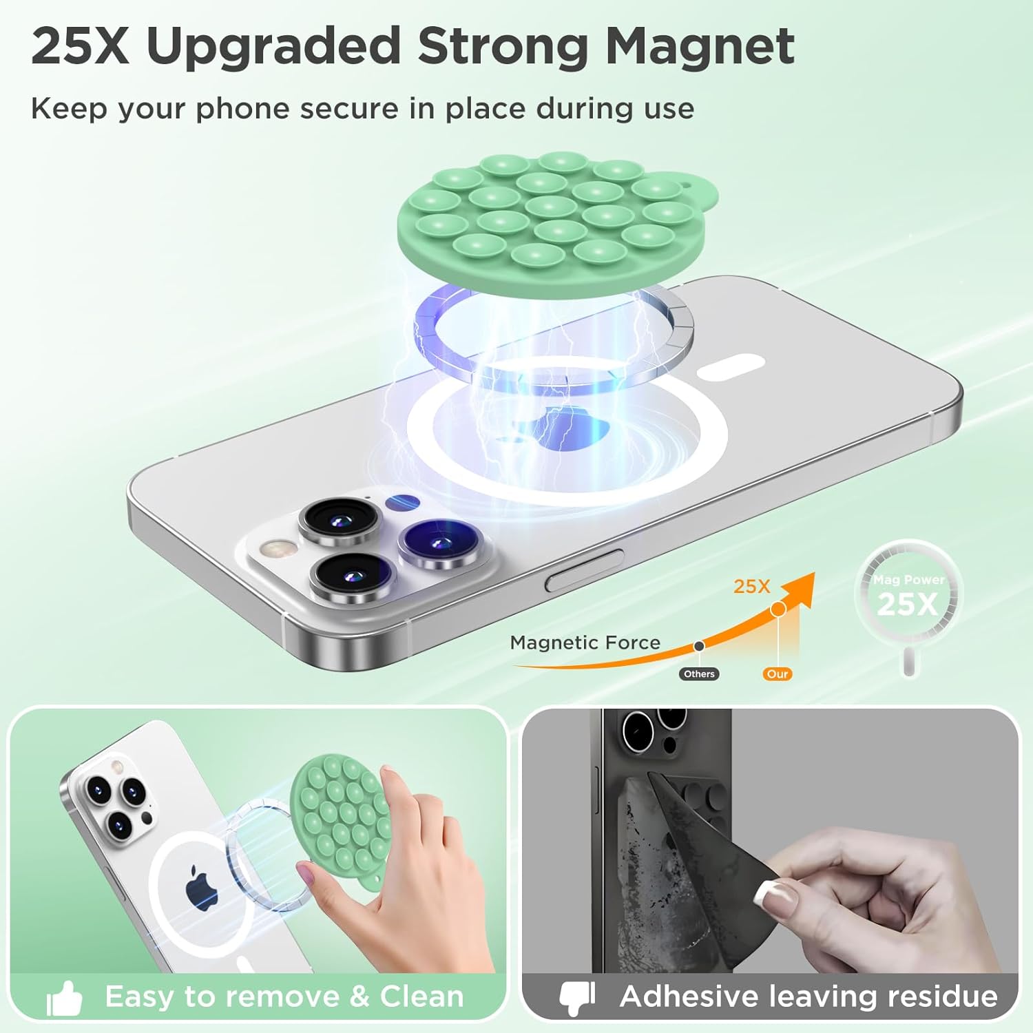 Magnetic Suction Cup Phone Mount for MagSafe Case, Silicone Hands-Free Grip Holder for iPhone and Android, Mirror Shower Phone Stand for Makeup FaceTime Gym Kitchen Bathroom, Spearmint Green