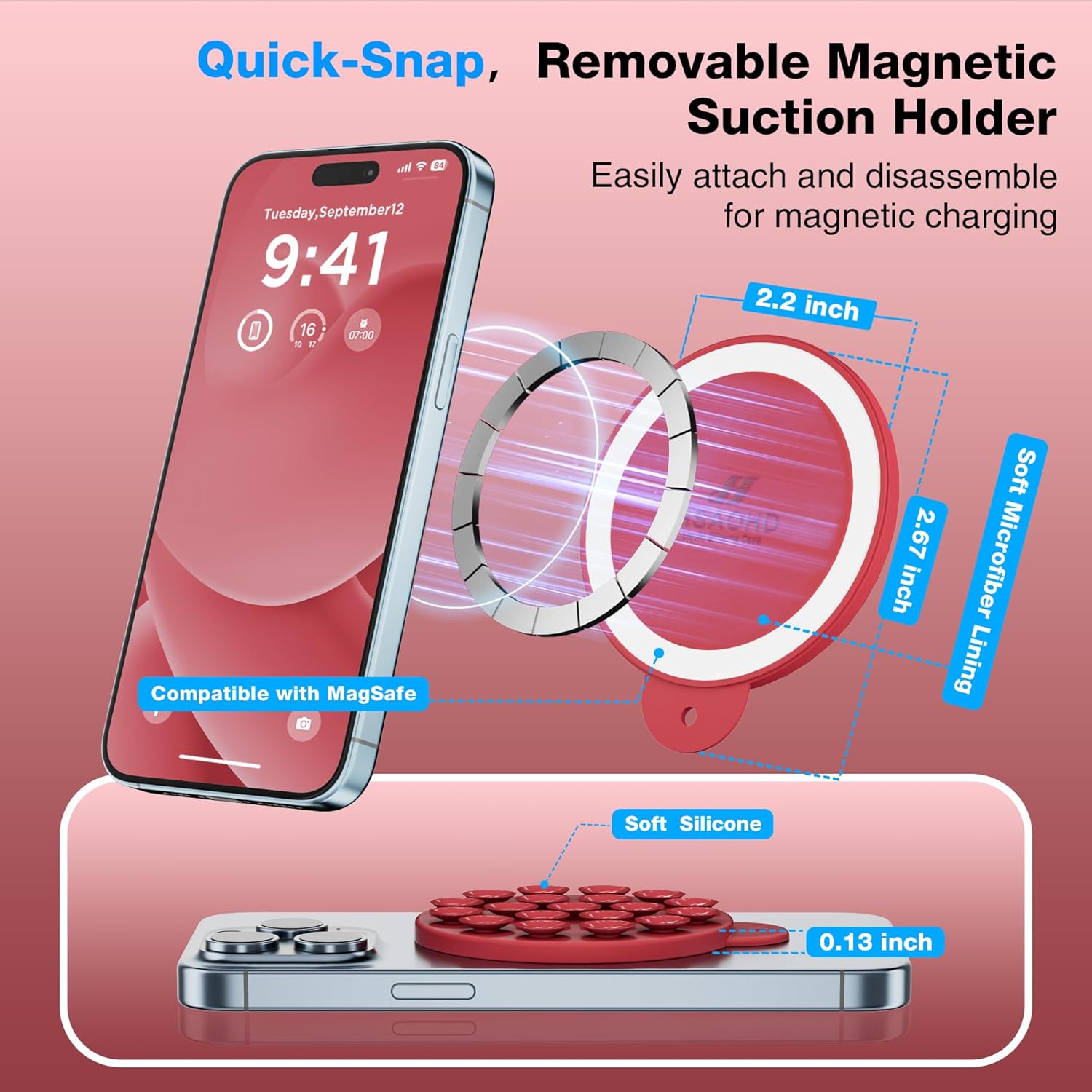 - 【Secure and Convenient】 Silicone magnetic suction cup phone holder with 19 individual suction cups, soft microfibre lining on the back won't scratch your phone, built-in extra wide strong neodymium magnets ensure a secure and long-lasting hold, Easily snaps on when you need it and easily detaches for magnetic wireless charging with no adhesive residue