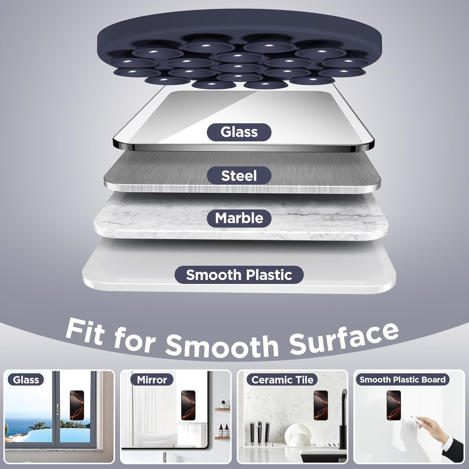 - 【Hands-free Holder】 Effortlessly stick your phone to flat, smooth, and glossy surfaces like mirrors or windows for hands-free selfies/videos, such as vanity mirrors, glass windows, countertops, refrigerators, tiles & even other phones or TVs! stylish and portable, ideal for home, gym, on the go and other scenarios