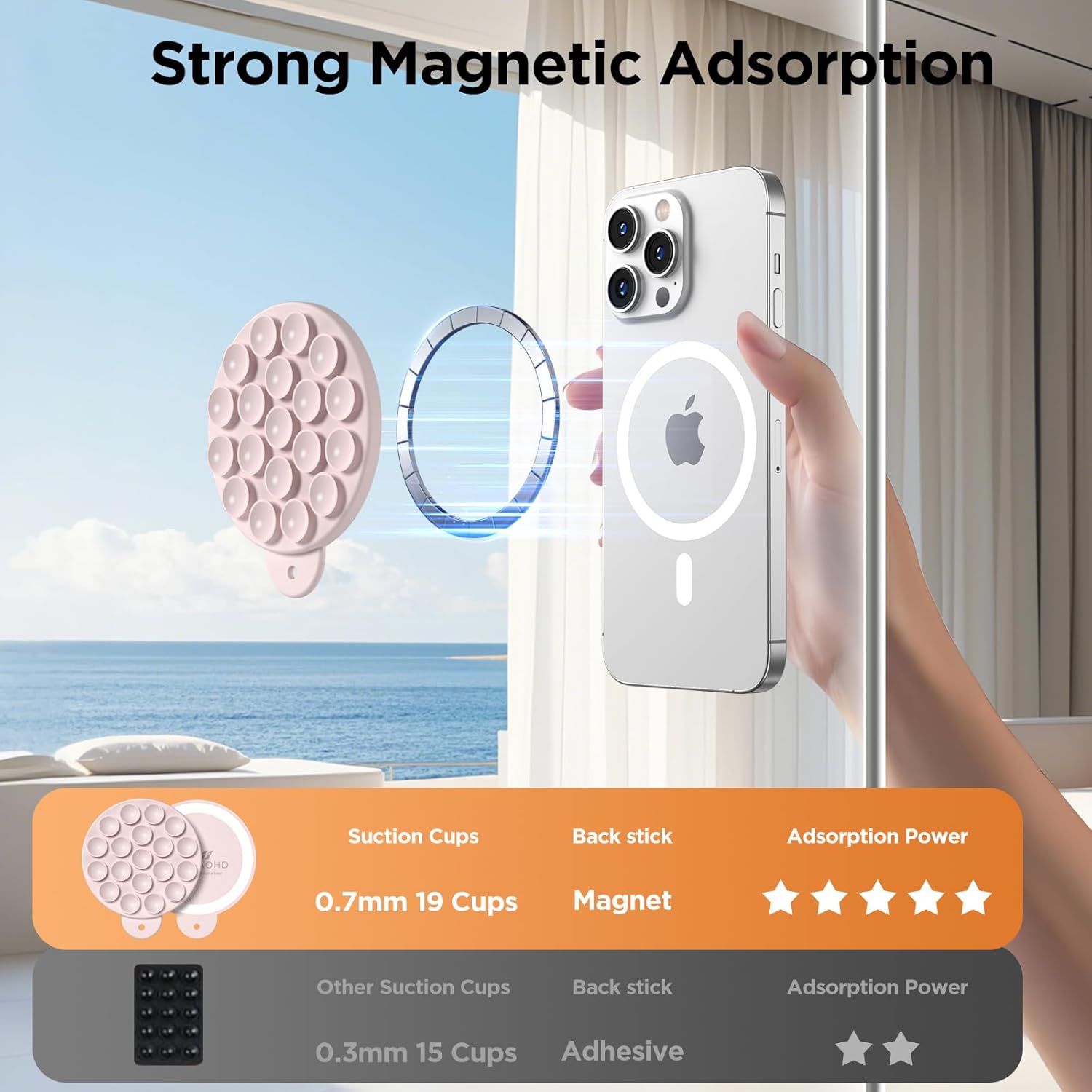 - 【Secure and Convenient】 Silicone magnetic suction cup phone holder with 19 individual suction cups, soft microfibre lining on the back won't scratch your phone, built-in extra wide strong neodymium magnets ensure a secure and long-lasting hold, Easily snaps on when you need it and easily detaches for magnetic wireless charging with no adhesive residue