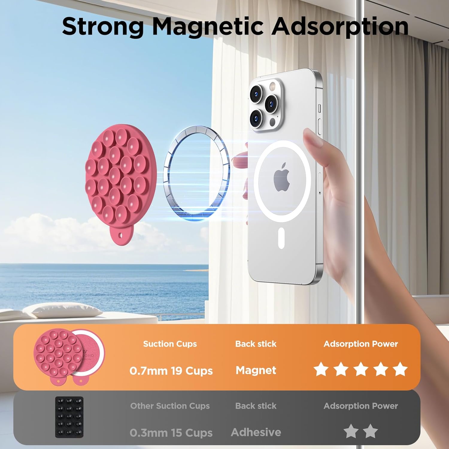 - 【Secure and Convenient】 Silicone magnetic suction cup phone holder with 19 individual suction cups, soft microfibre lining on the back won't scratch your phone, built-in extra wide strong neodymium magnets ensure a secure and long-lasting hold, Easily snaps on when you need it and easily detaches for magnetic wireless charging with no adhesive residue