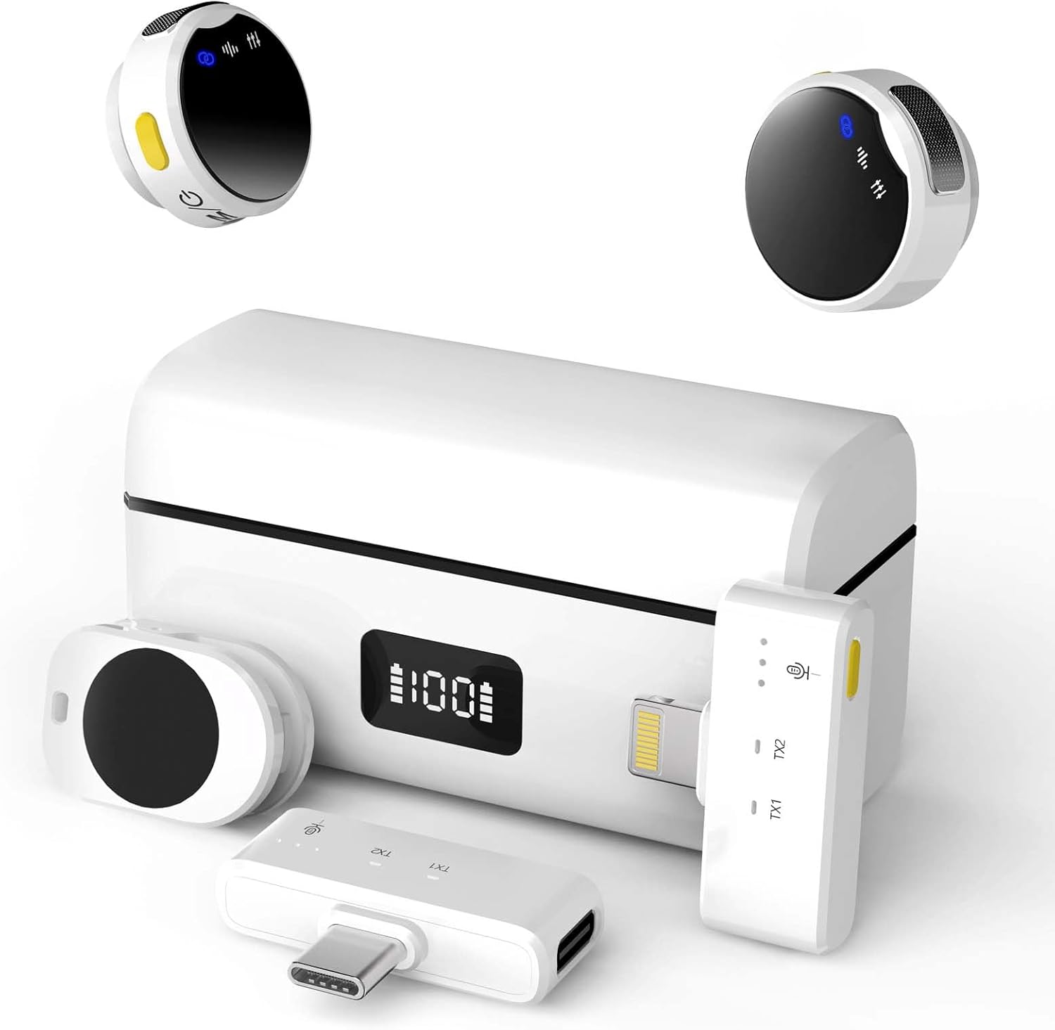Wireless Lavalier Microphone for iPhone/Android with Lightning/USB C(2 TX+2 RX+Charging Case), Mini Microphone with Noise Cancellation, 35H Battery, Clip on Lapel Mic for Video Recording Vlog