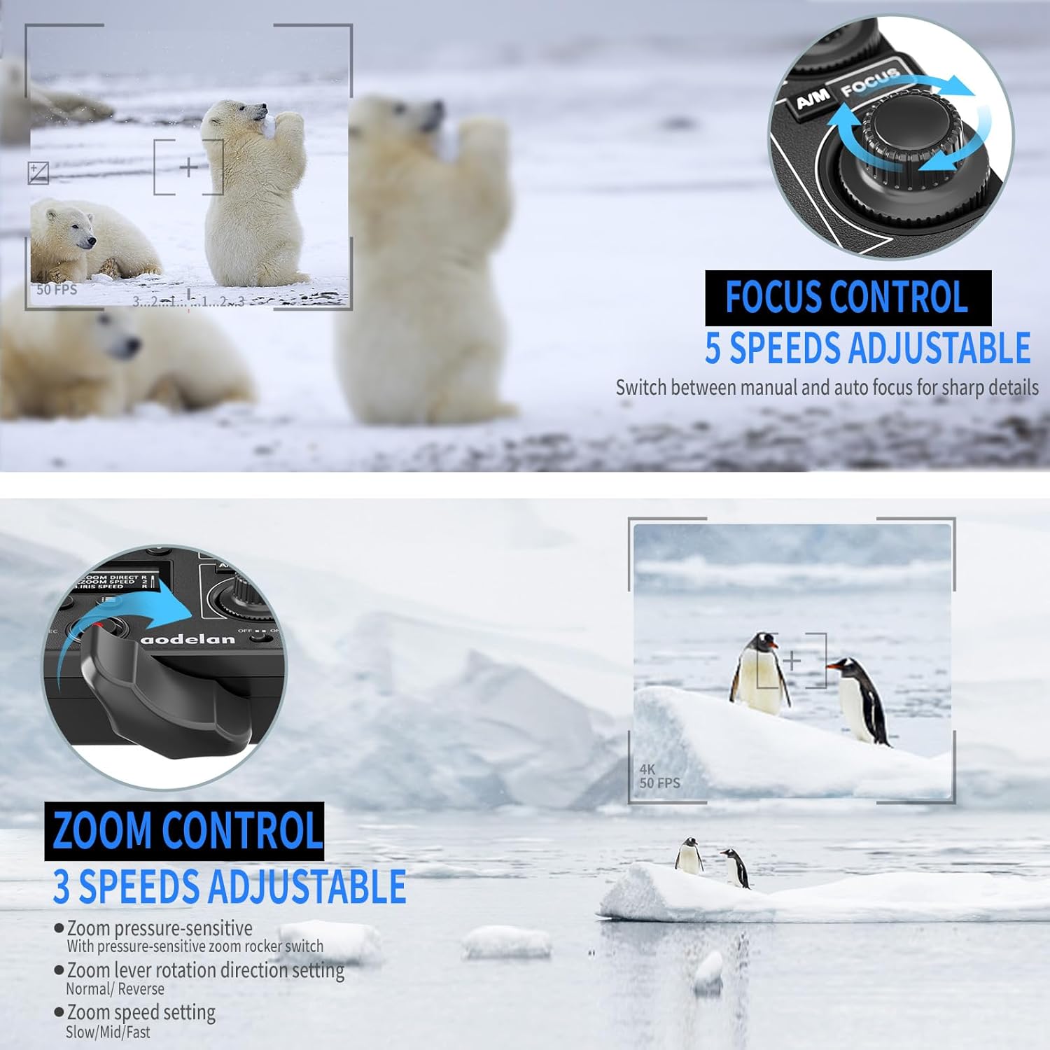 - 【Comprehensive Camera & Lens Control】 - The AODELAN ZC-4 Camera Remote offers precise control over essential camera settings, including recording, display, shutter speed, and white balance. It supports manual focus (5 levels), iris control (3 levels), zoom control (3 levels), and ND filter adjustments for optimal exposure. For cameras with an electronic ND filter, the remote includes a dedicated knob for easy density control, simplifying complex lighting conditions.
