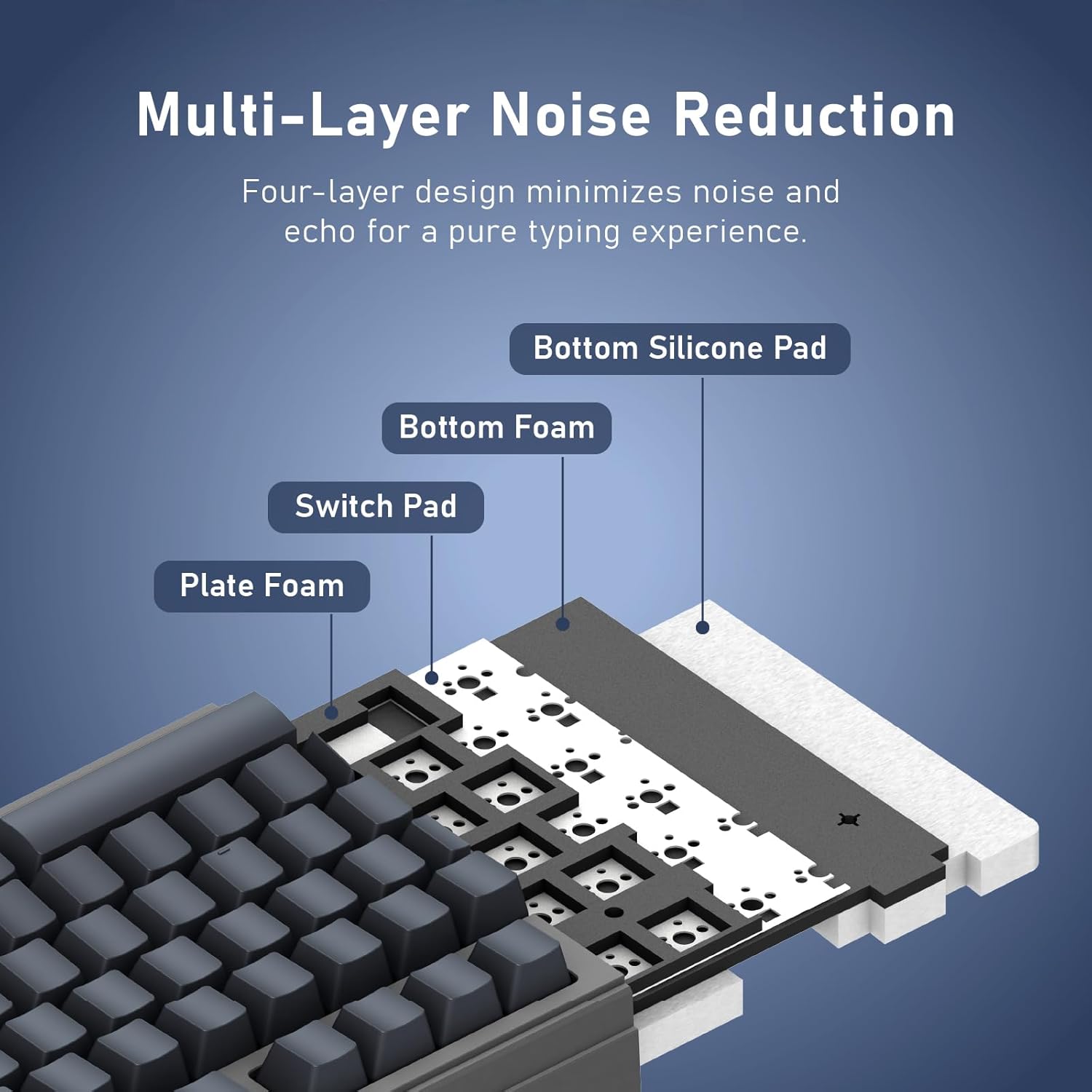 - The Gasket Mount Structure ⚡️ K85R employs a modular design with flexible pads to secure the keys, addressing the uneven feel caused by traditional screw mounting. This ensures a more uniform keypress experience, providing users with a consistent, soft, and pleasant typing experience