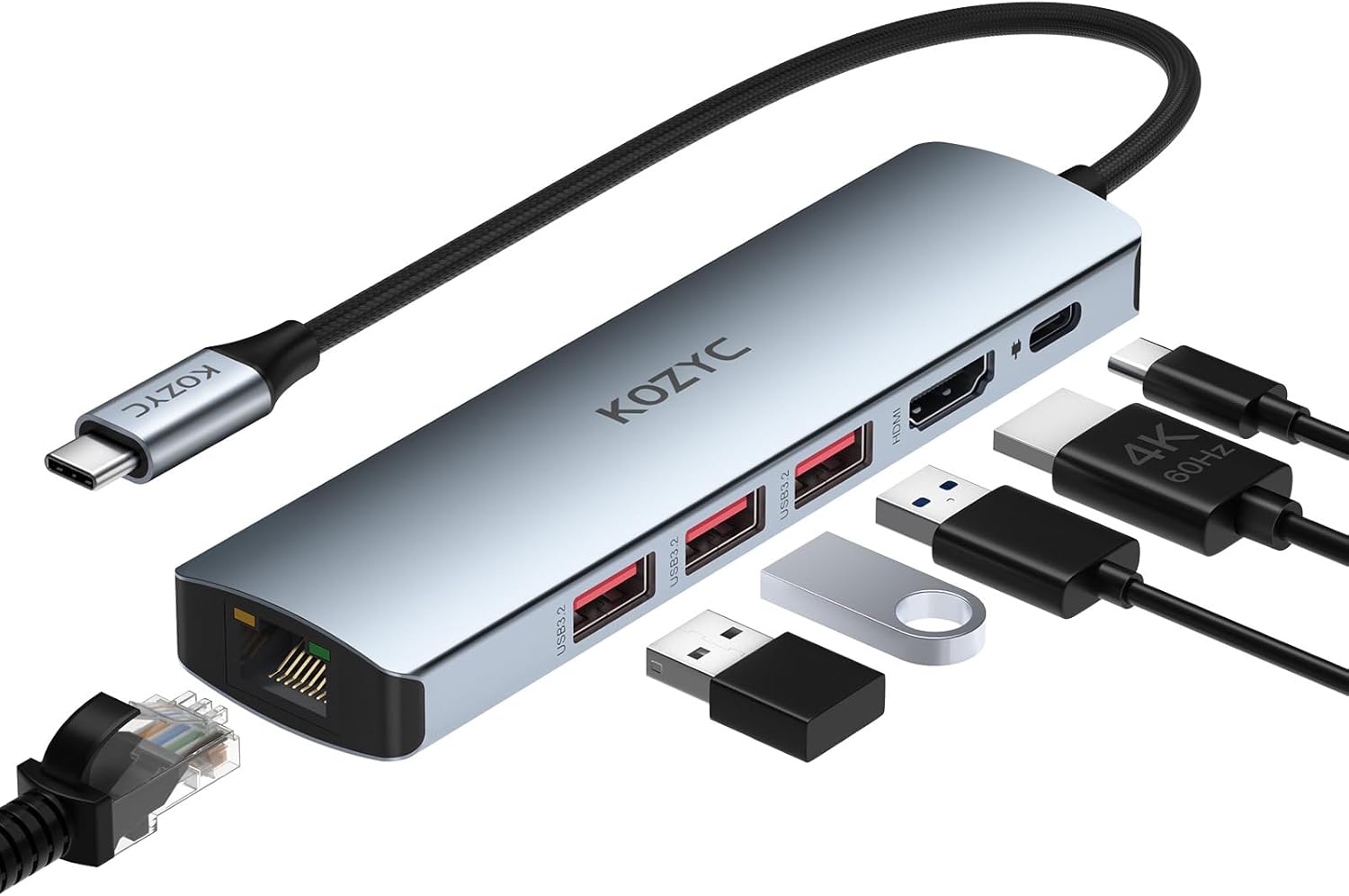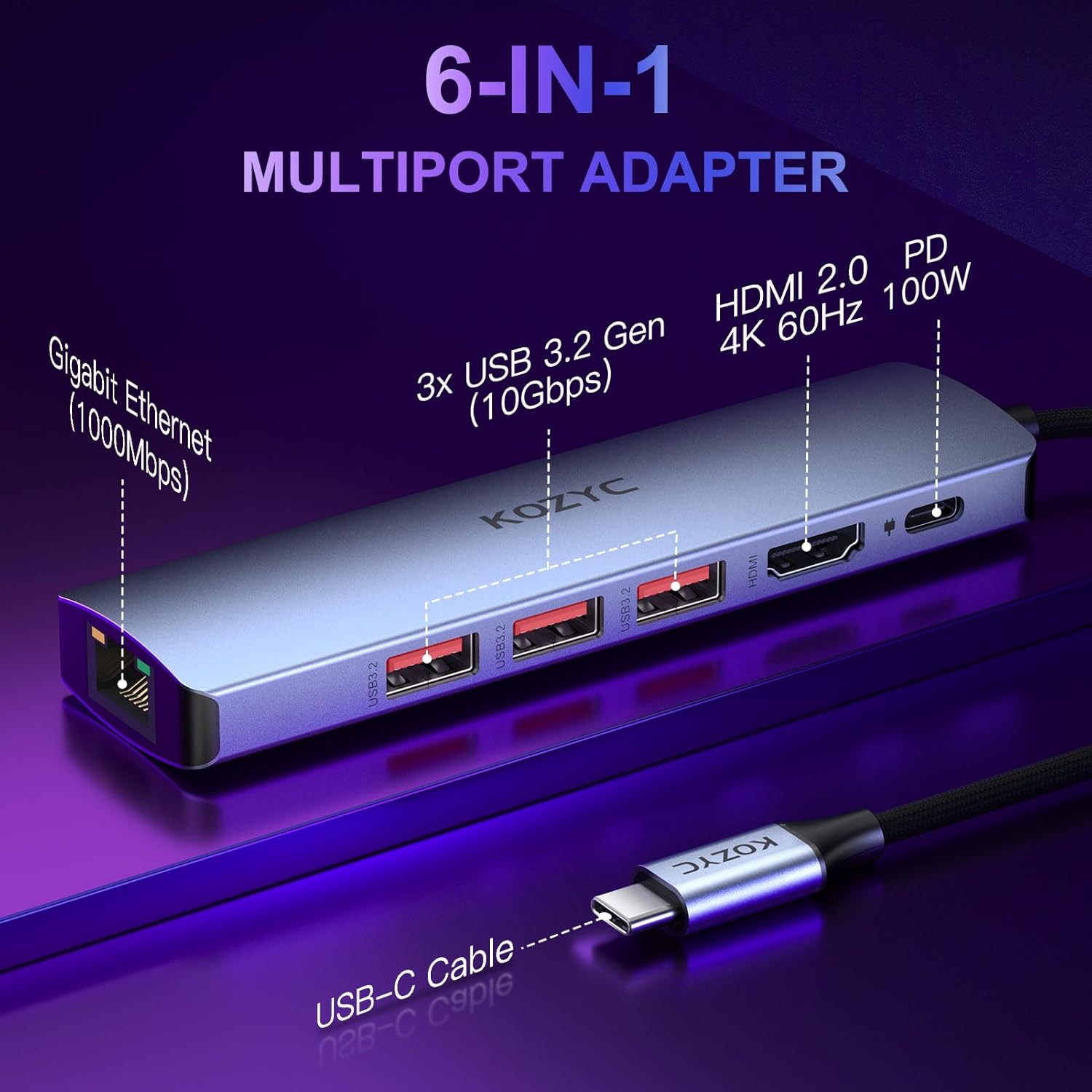 USB C Hub Ethernet, KOZYC 6-in-1 USB C Hub with 10Gbps, HDMI 4K 60Hz, 1Gbps Ethernet, 3xUSB-A 3.2, 100W PD Compatible with MacBook Air/Pro, XPS13/15, Dell