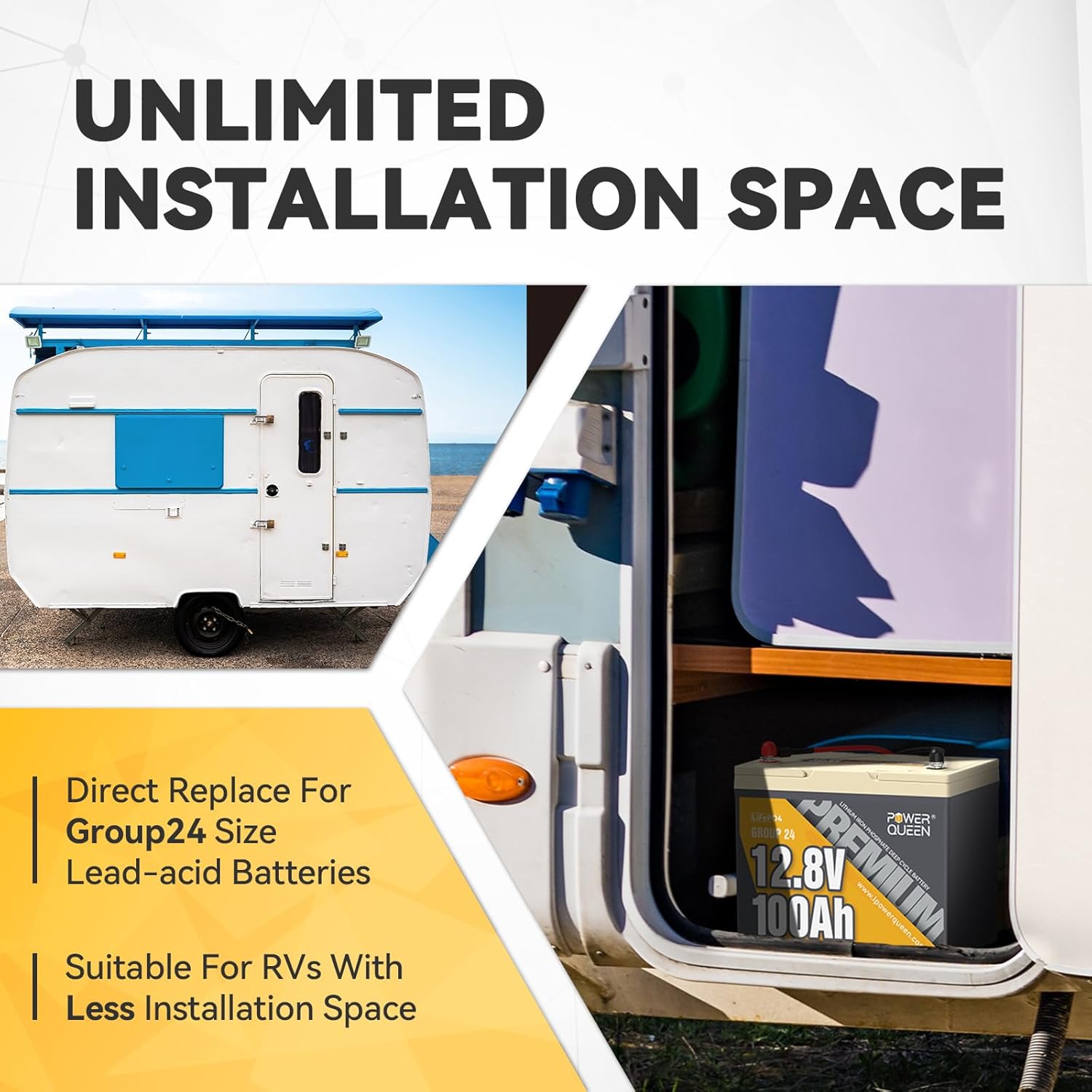 - 【Effortless Upgrade to Group 24 Size】The Power Queen 12V100Ah Premium battery is meticulously crafted to meet the BCI standard minimum size for Group24 batteries. Upgrading from lead-acid to lithium has never been smoother—simply replace your Group24 battery without the hassle of modifying your existing electrical system or wiring. Enjoy a faster and more straightforward transition to superior power.