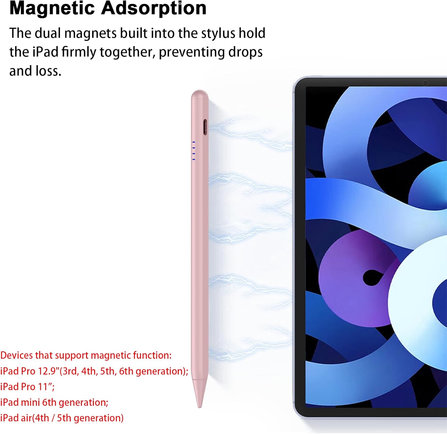 - 【Palm Rejection / Magnetic Function】 The stylus pen for ipad has Palm Rejection function, no need to wear gloves when writing, you can rest assured that your hand on the screen drawing, for your fine writing Drawing convenience. This iPad Tablet Pen is also built-in two magnets, which can be attached to the side of iPad Pro 11-inch (1/2/3 Gen), iPad Pro 12.9-inch (3/4/5 Gen), iPad Air (4/5 Gen), and iPad mini 6, so it never scrolls away. (Note: This stylus pen does not support wireless charging)