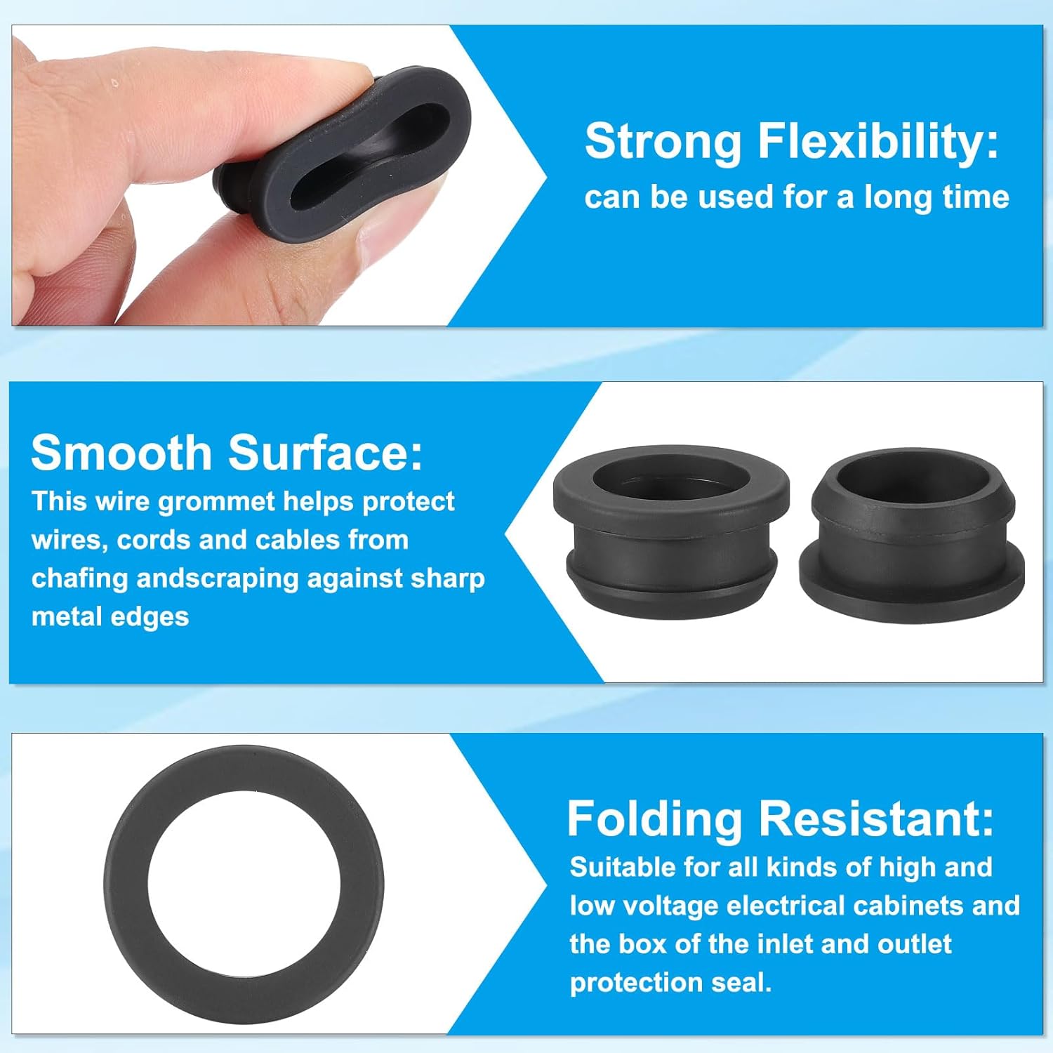- Advantage: The rubber grommets are made of silicone rubber, which is flexible, durable, folding resistant, and has a strong insulation protection function. It is designed to protect wires from chafing and wear when passing through holes and it can be used for a long time to solve the problem of long-term wire protection and can be used to manage and route cables in a neat and organized fashion.