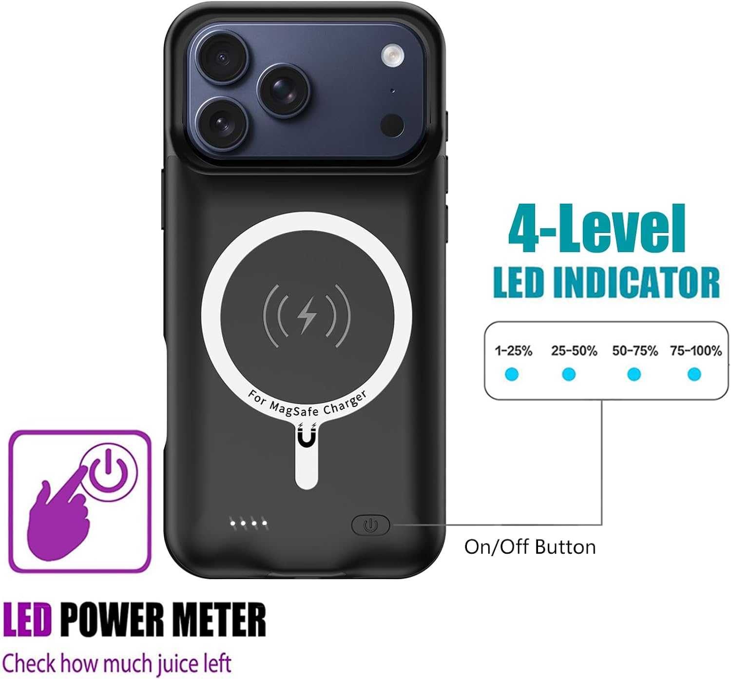 - 4 LED POWER INDICATOR : This for iPhone 17 Pro battery pack the features of 4 LED battery level indicator letting you know exactly the power you have (25%--50%--75%--100%); besides, you could switch on/off the battery case with the power switch button on the bottom.