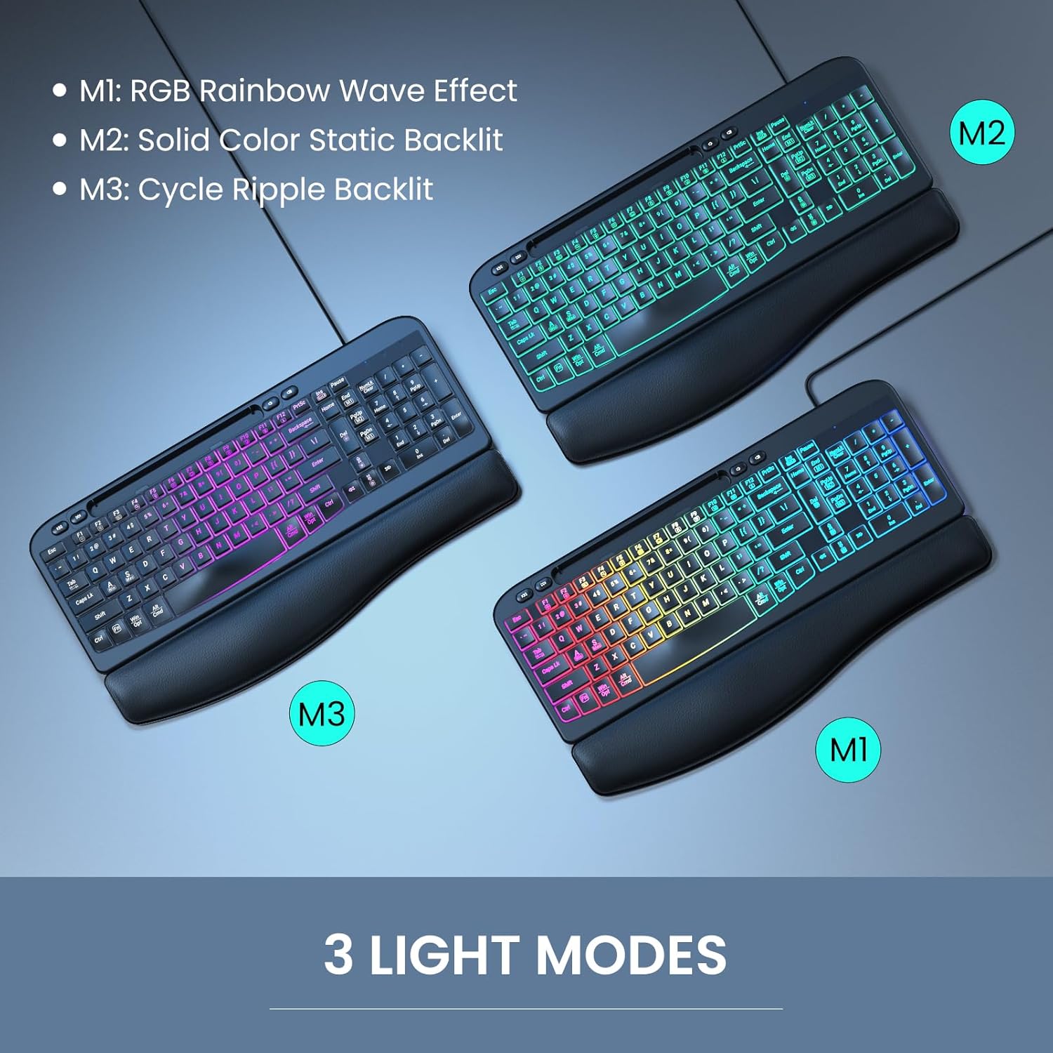Ergonomic Backlit Keyboard with Wrist Rest, 7 Colors USB Wired Computer Keyboard, Wave Keys, with Phone/Tablet Holder, Comfortable Lighted Keyboard for PC, Windows and Mac