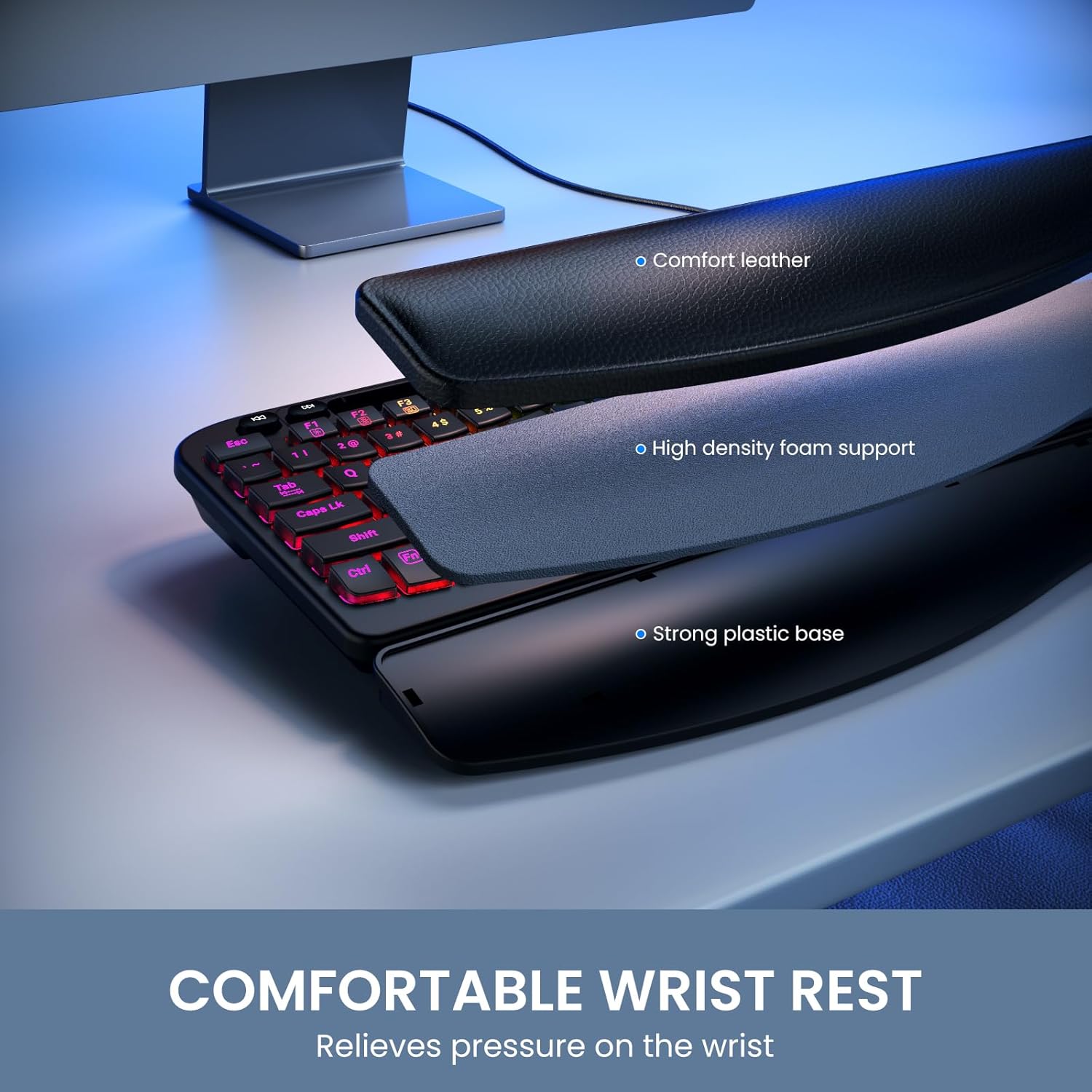 - Soft Wrist Rest: The wired ergonomic keyboard includes a leather wrist rest that provides extra support, reducing wrist fatigue during extended typing sessions. Great for work and gaming, it promotes a more comfortable typing experience.