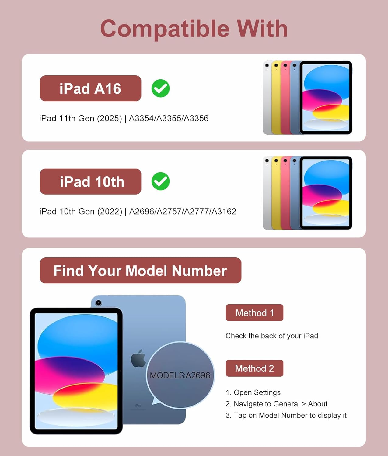 - For iPad 11th/10th Generation Case with Keyboard: This keyboard case compatible with iPad (A16 ) 11th Generation 11-inch 2025 (Model Number: A3354/A3355/A3356), compatible with iPad 10th Generation 10.9 inch 2022 (Model Number: A2696/A2757/A2777/A3162). NOT compatible with any other tablet models. Please check the model number starting with "A" on the back of your tablet before purchasing