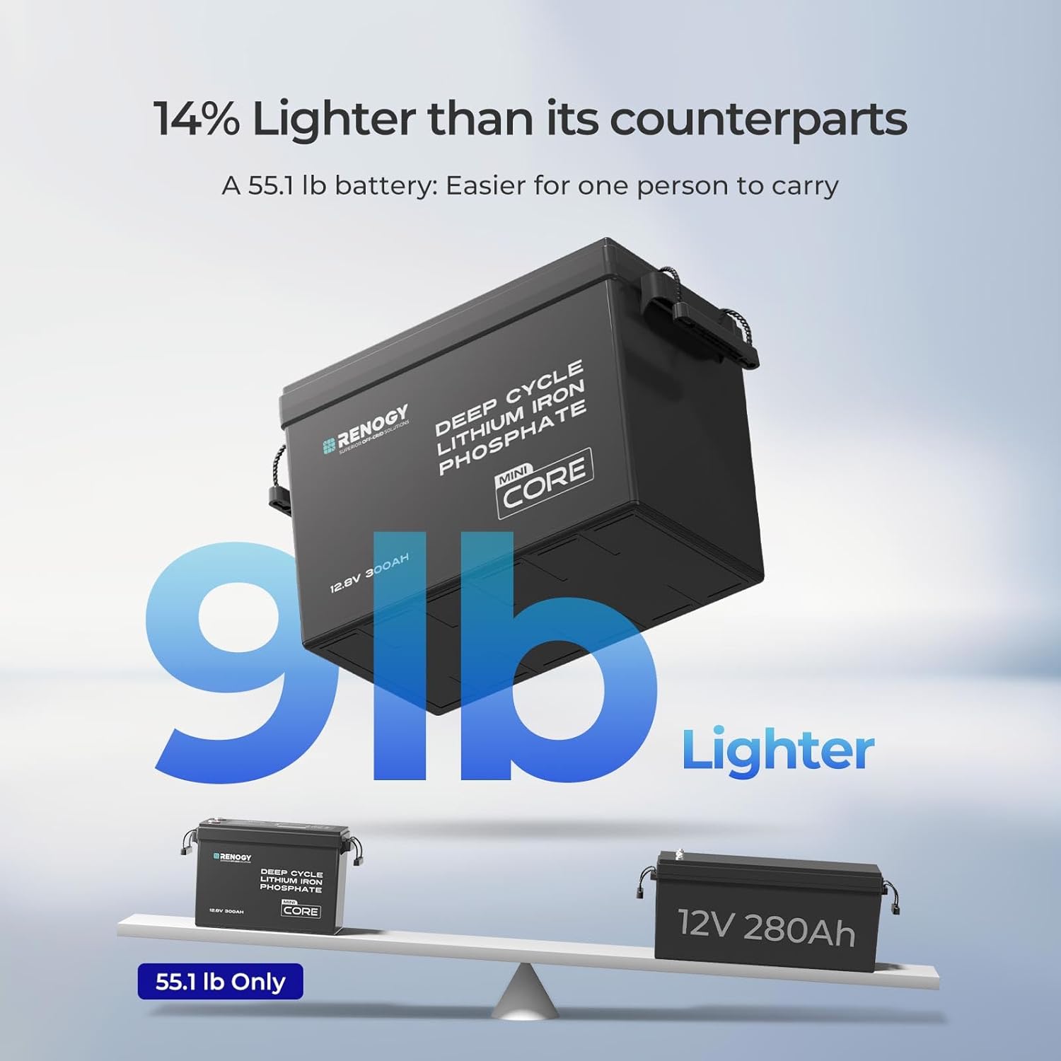 - Industry-leading lightweight & Ultra-Compact Design: Weighing only 55.1 lbs (25 kg), this renogy 12V 300Ah battery offers significant weight savings. It is 57% lighter than a 12V 200Ah lead-acid battery. The new compact design (15.12 × 7.64 × 9.96 inches) optimizes space and is 31% more space efficient when compared to other 12V 300Ah LiFePO4 batteries.