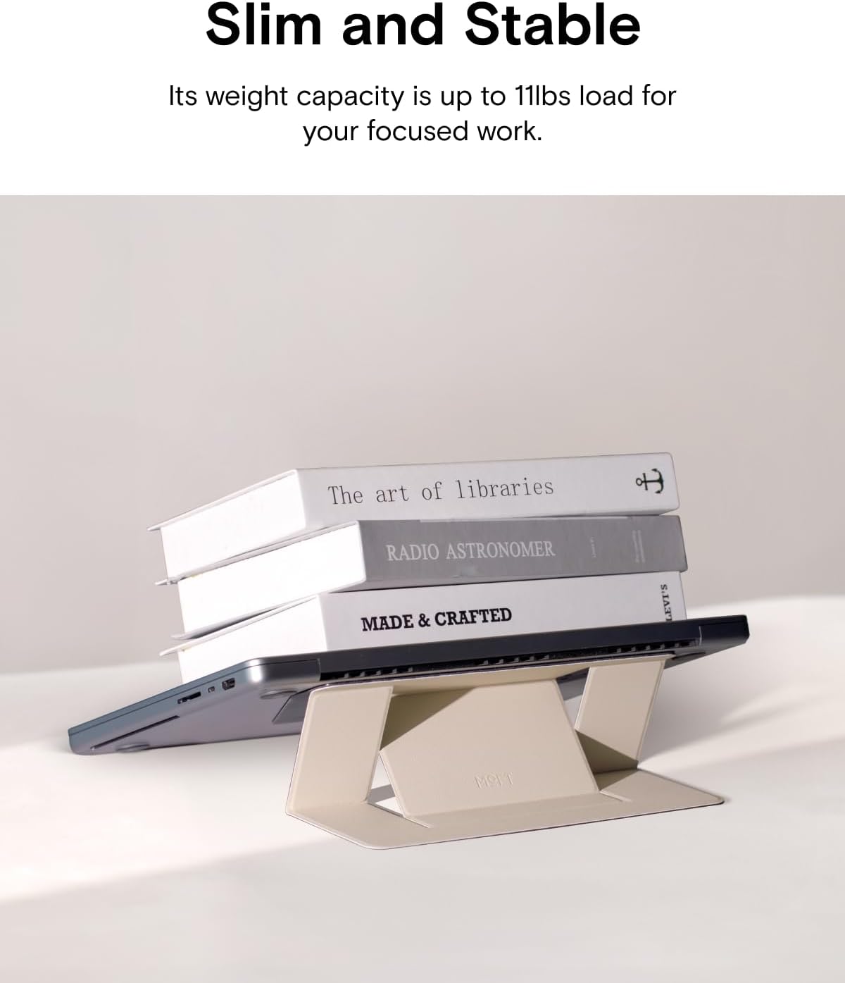 - [Paper-Thin] MOFT laptop stand is only 0.1 in thin and weighs a mere 3 oz, its small mearsurements makes it unfelt when carried and unsee when not in use.