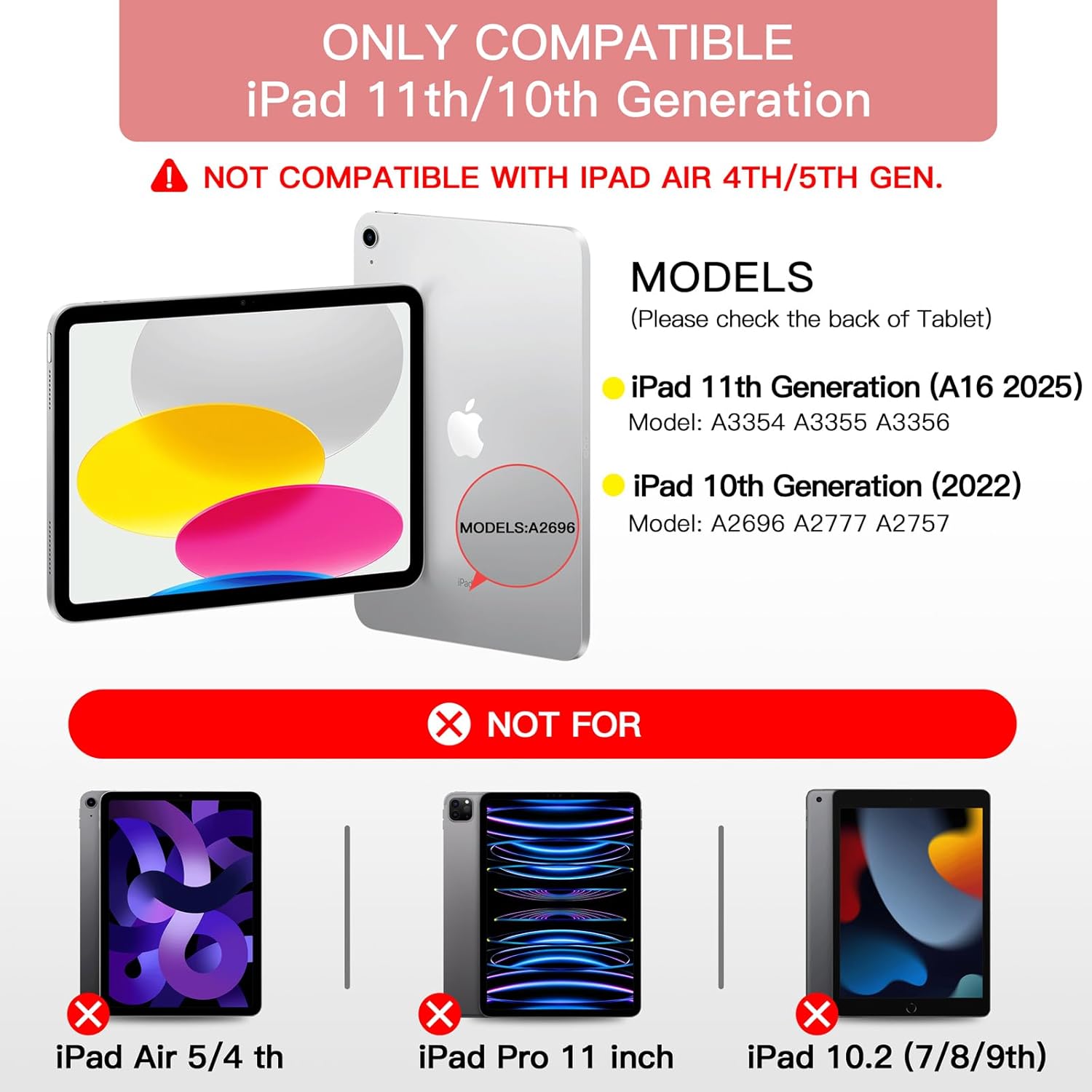 - 【ipad keyboard】ipad 10th generation case with keyboard iPad (A16) 11th generation 11 inch 2025 (Model: A3354/A3355/A3356), For iPad 10th generation 10.9 inch 2022 (Model: A2696/A2757/A2777). It is Not compatible with any other models. Please check the models starting with "A" on the back of the iPad.