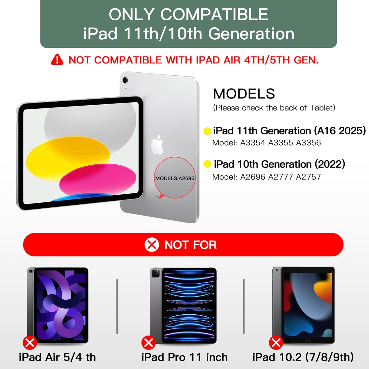 - Compatible Devices : ONLY Compatible with iPad A16 11th 2025 (Model: A3354, A3355, A3356) & iPad 10th Generation (Model:A2696/A2757/A2777) ONLY Compatible with iPad A16 11th 2025 (Model: A3354, A3355, A3356) & iPad 10th Generation (Model:A2696/A2757/A2777)