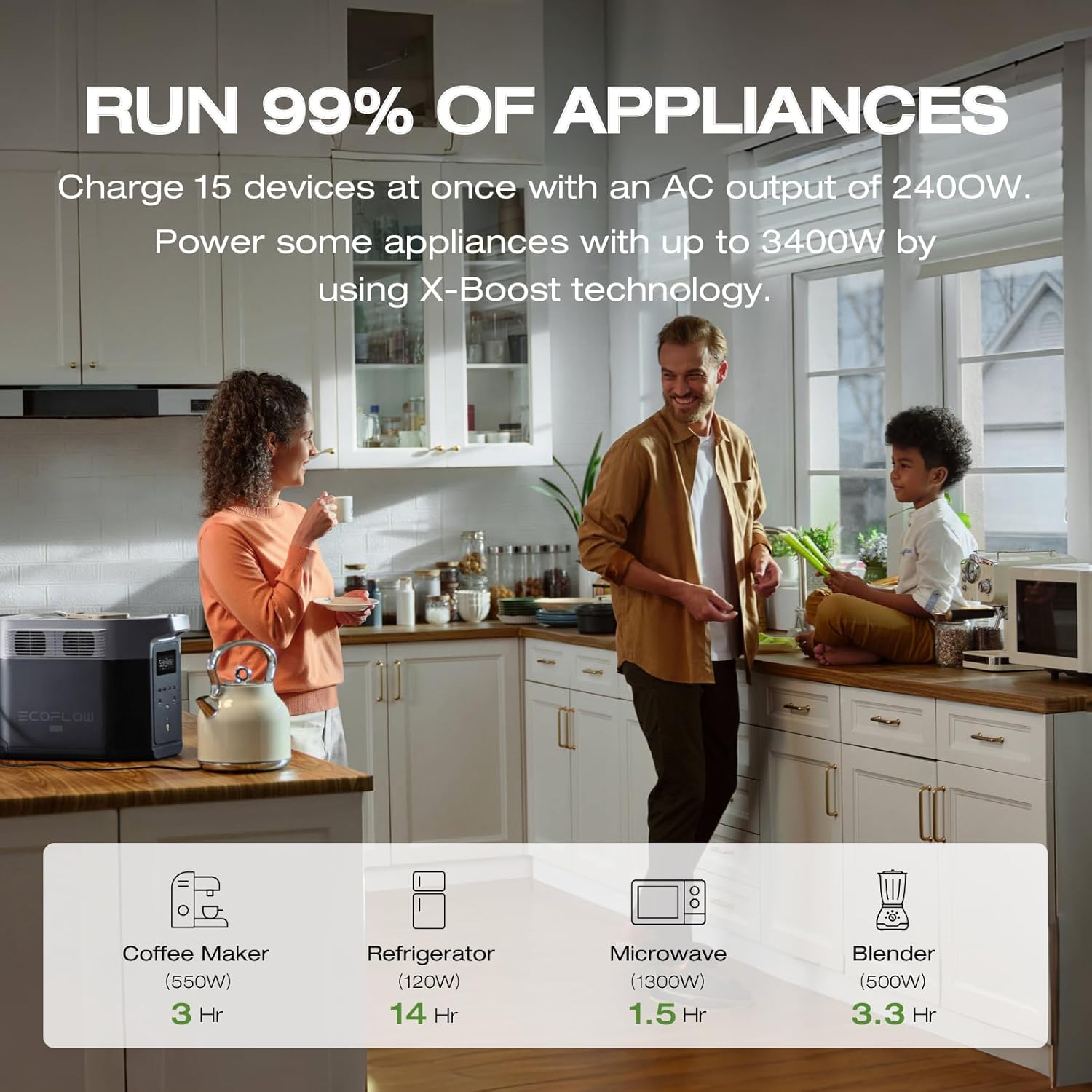 - [Power 99% of Your Household Devices] Run pretty much any of your home appliances with an output of up to 2400W. With 15 outlets, there's space for any device. Plus, with X-Boost mode, power some high-wattage appliances with up to 3400W.