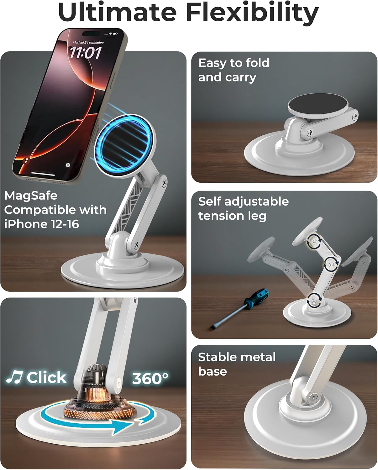 - Adjustable, Stable: 360° rotating iPhone stand for desk for video recording, calls, streaming, reading, charging; 3-axis tightening leg, non-slip weighted base keeps Mag Safe stand in place