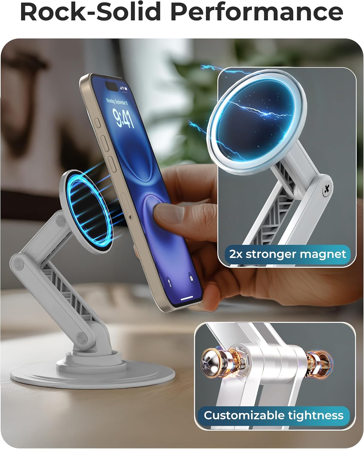 - Built for Heavy Use: iPhone holder for desk with sturdy metal base, strong magnet, robust ABS leg & tightenable screws for daily wear & tear; charging cable-friendly filming magnetic iPhone holder