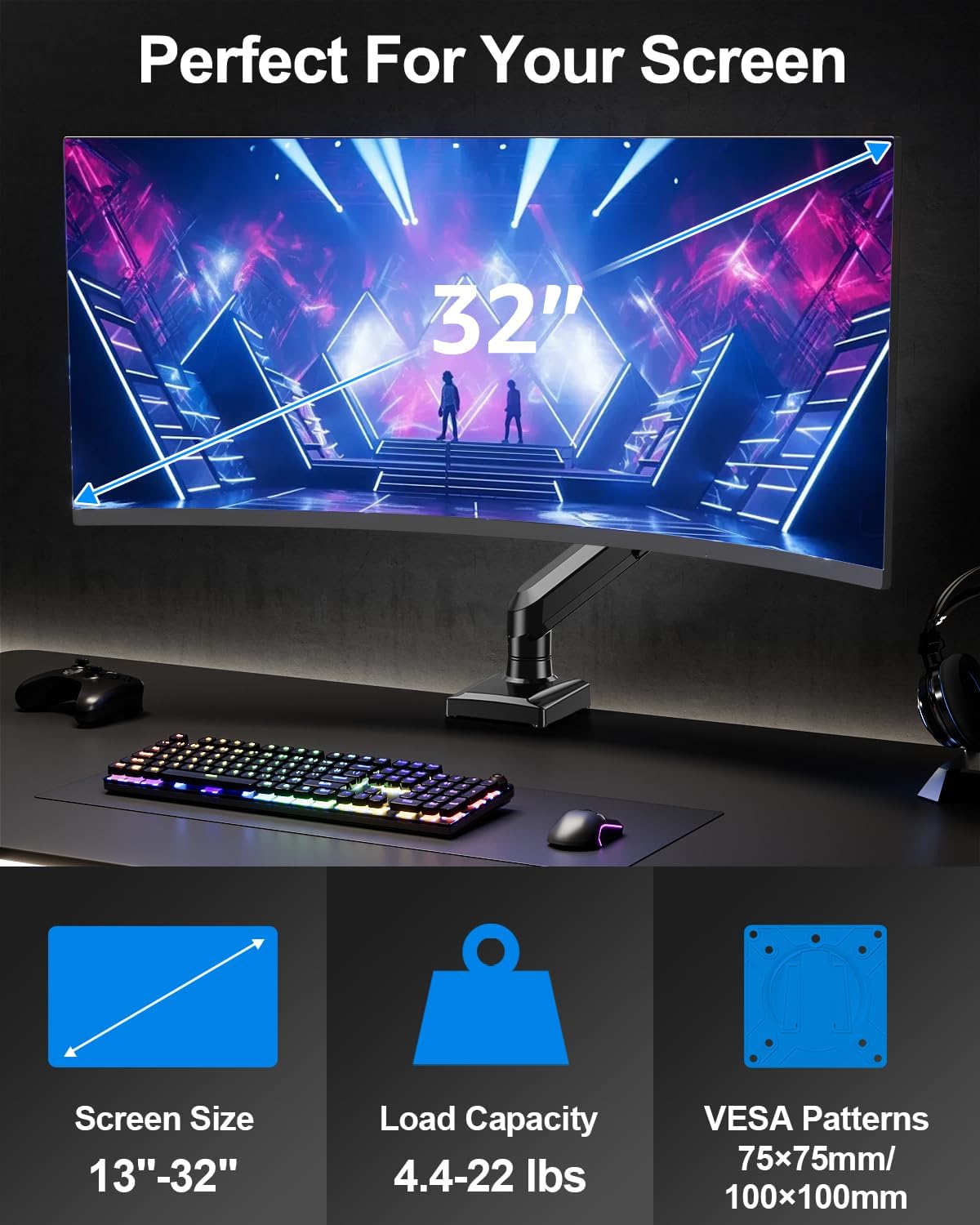 - Universal Compatibility: The gas spring monitor arm provides upgraded loading capacity and can securely and easily hold monitors 13,19,21.5,22,23,24,27,32 inches and supports 4.4-22lbs monitors. Compatible with VESA 75x75mm and 100x100mm.