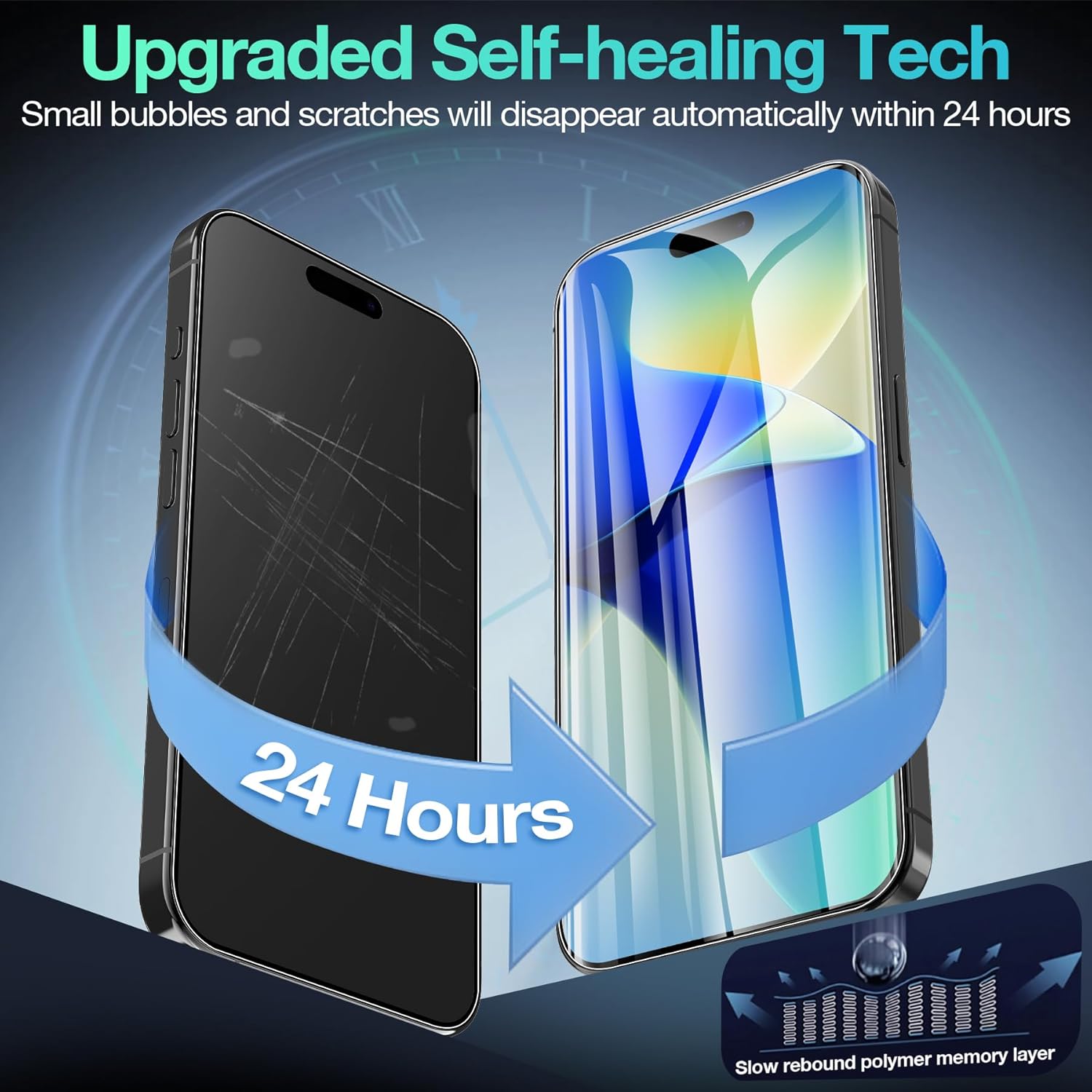 - 【Scratch Auto-Repair】- The hydrogel film has slow rebound technology and self-healing power. Minor scratches and bubbles will automatically be repaired within 24 hours. (If there are bubbles after installation, please do not tear off and wait for 24h)